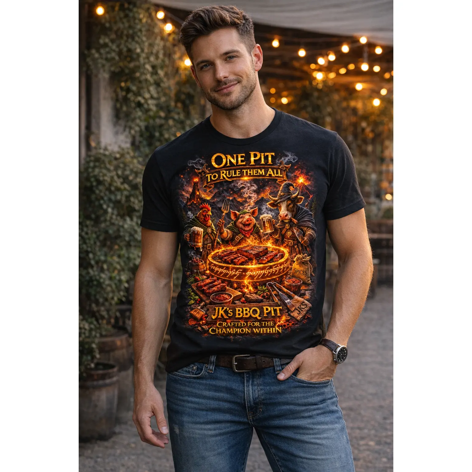 This soft, breathable tee carries a bold, rustic grilling scene that feels alive with smoke, heat, and laughter. The artwork centers around a blazing pit ringed with animated characters and smoky, ember-lit details — a shirt that reads like a weekend backyard legend. Wear it to backyard cookouts, competition barbecues, or when you want to bring a little fire-and-friends energy to a casual night out. Lightweight cotton and a retail crew neck keep the look clean and easy to layer under aprons or jackets. The design sits prominently on the chest so the story — and the invite to gather — is unmistakable.