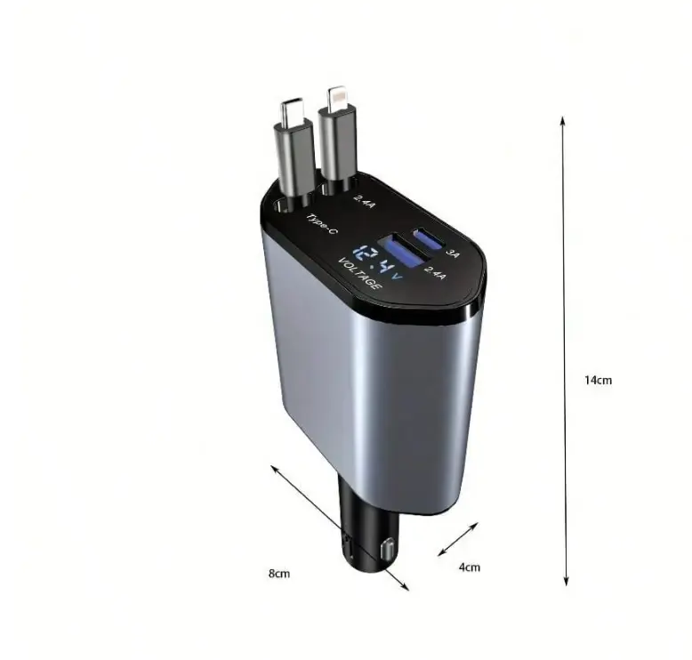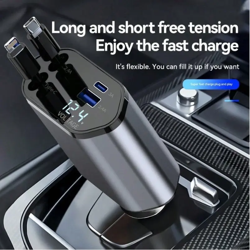 The cable's retractable design makes it easy to store and carry. Whether at home or on the go, this charger adapts to your needs. The 4-port setup allows you to charge various devices efficiently.