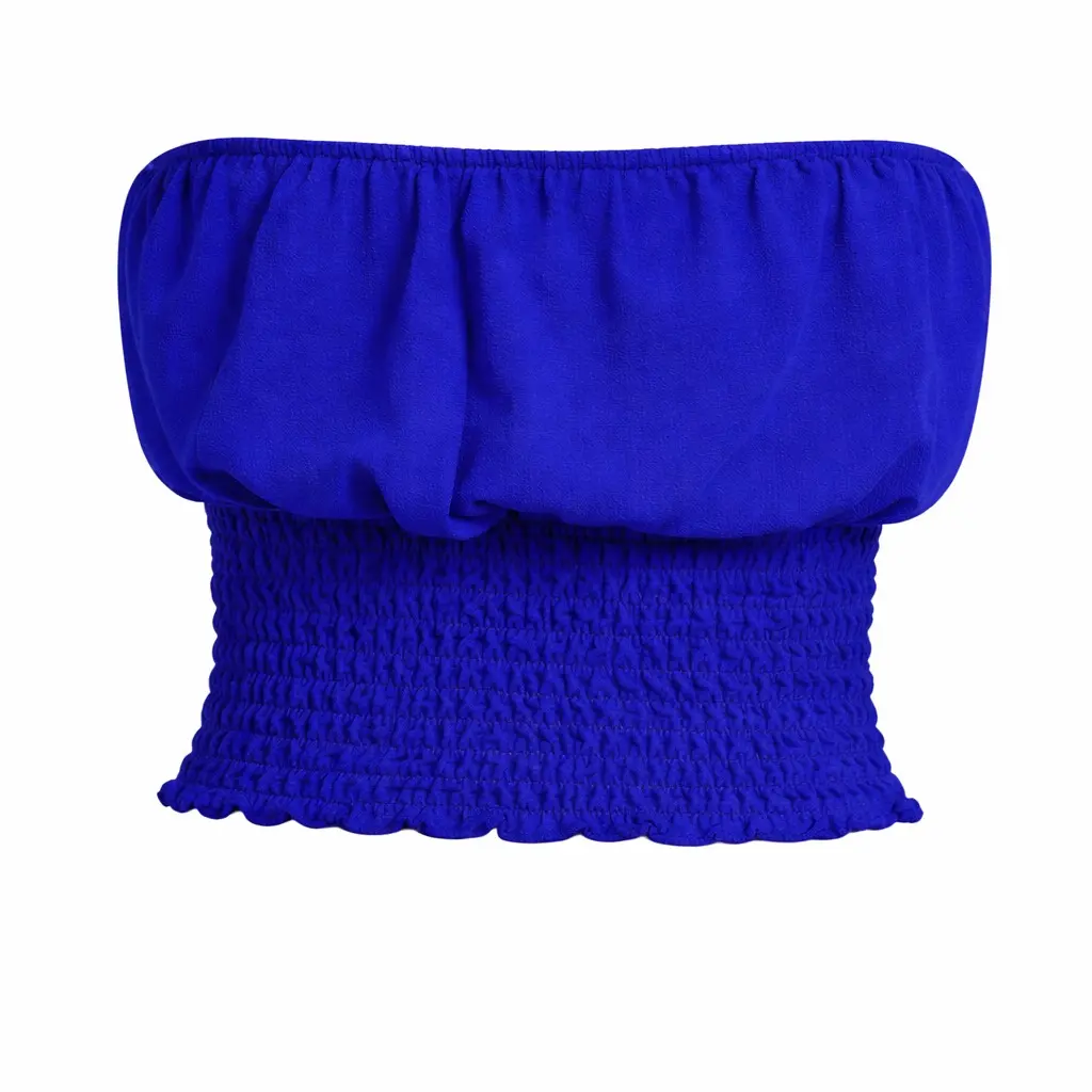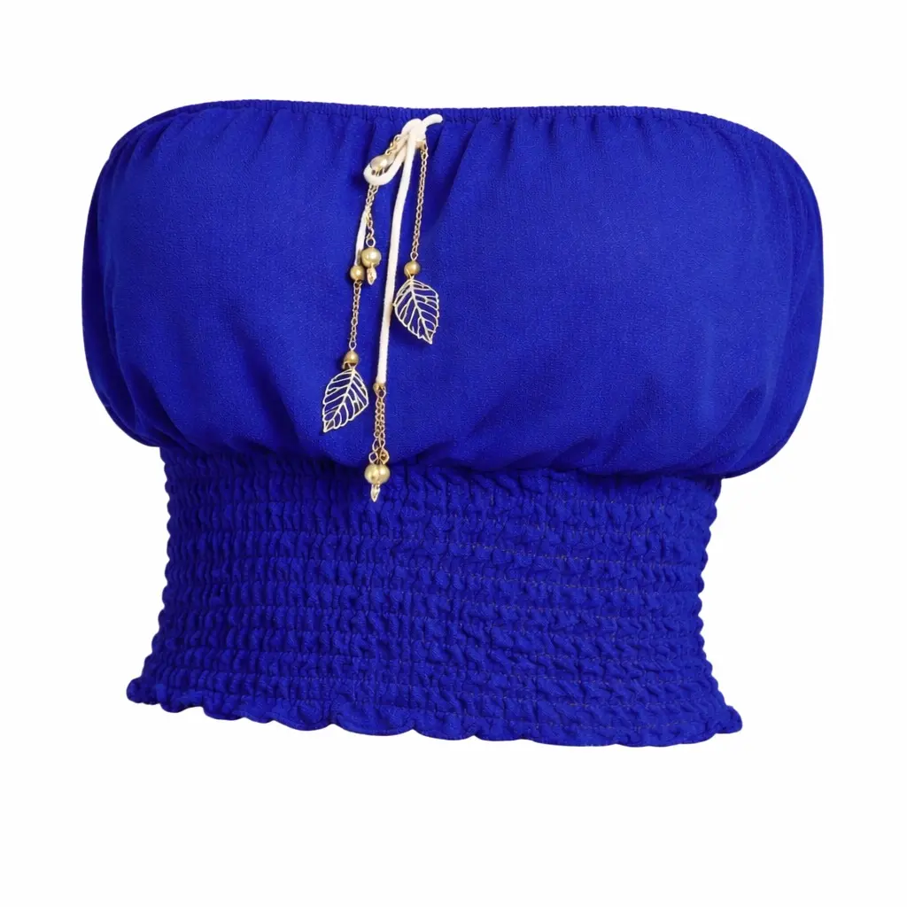 Top strapless en color azul vibrante con diseño cómodo y elástico que se adapta perfectamente al cuerpo. Incluye detalles decorativos en cordón con accesorios dorados que le dan un toque elegante . Ideal para looks casuales, verano o salidas con estilo .