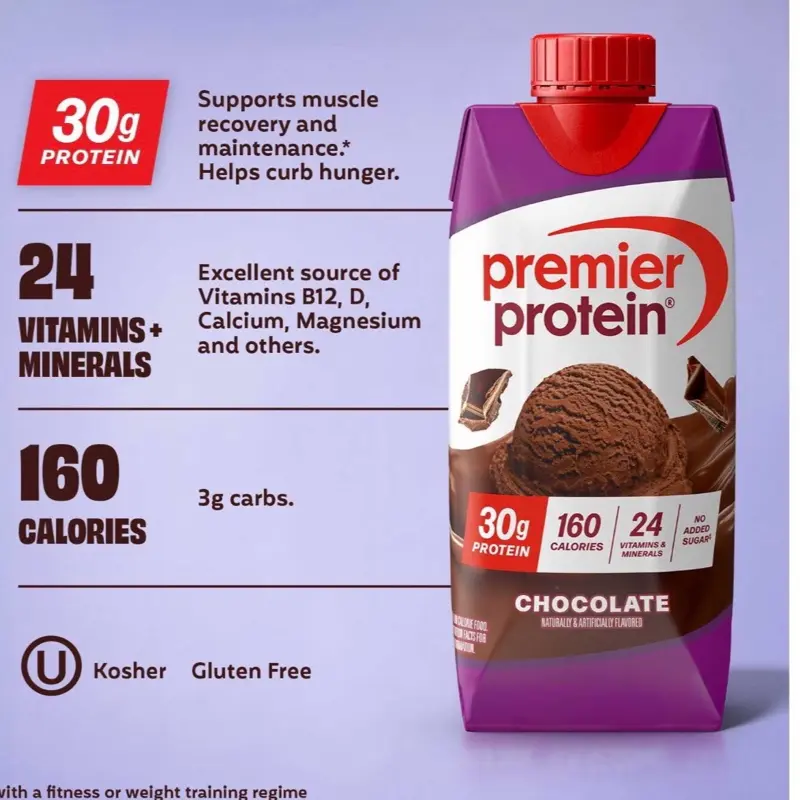 • 15 resealable cartons of Premier Protein high protein chocolate shakes, each containing 11 fl. oz.