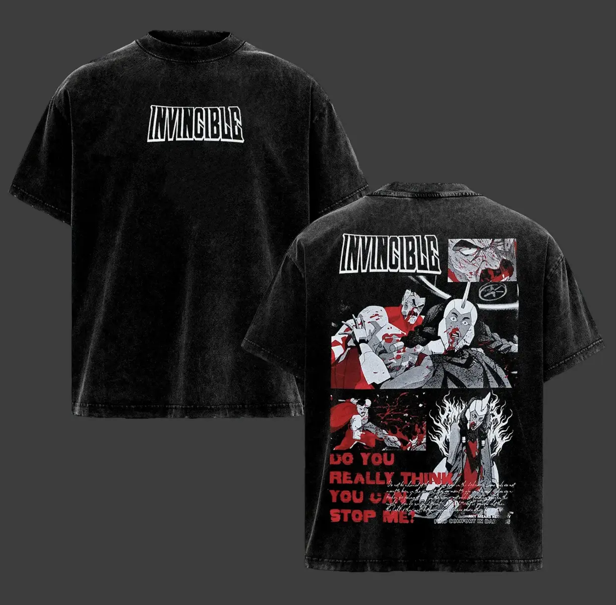 Vintage Washed Omni-Man Invincible Graphic T-shirt, Retro Comic Superhero Streetwear T-shirt, Oversized Heavy Cotton Pullover T-shirt with Dark Action Back Print, Casual Unisex T-shirt Gift for Comic Fans