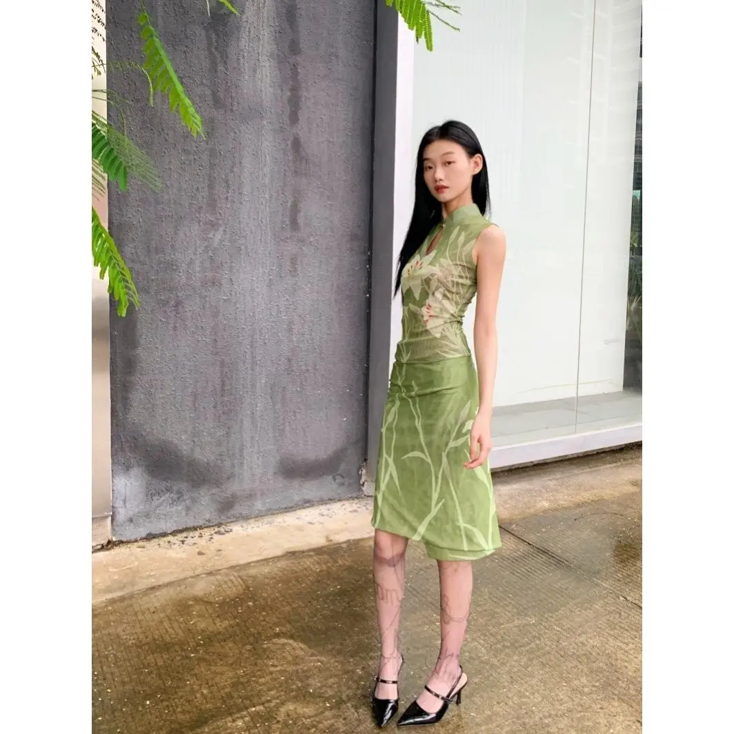 High-quality cool and elegant new Chinese-style women's summer set, featuring a jacquard sleeveless top and satin half-skirt two-piece set