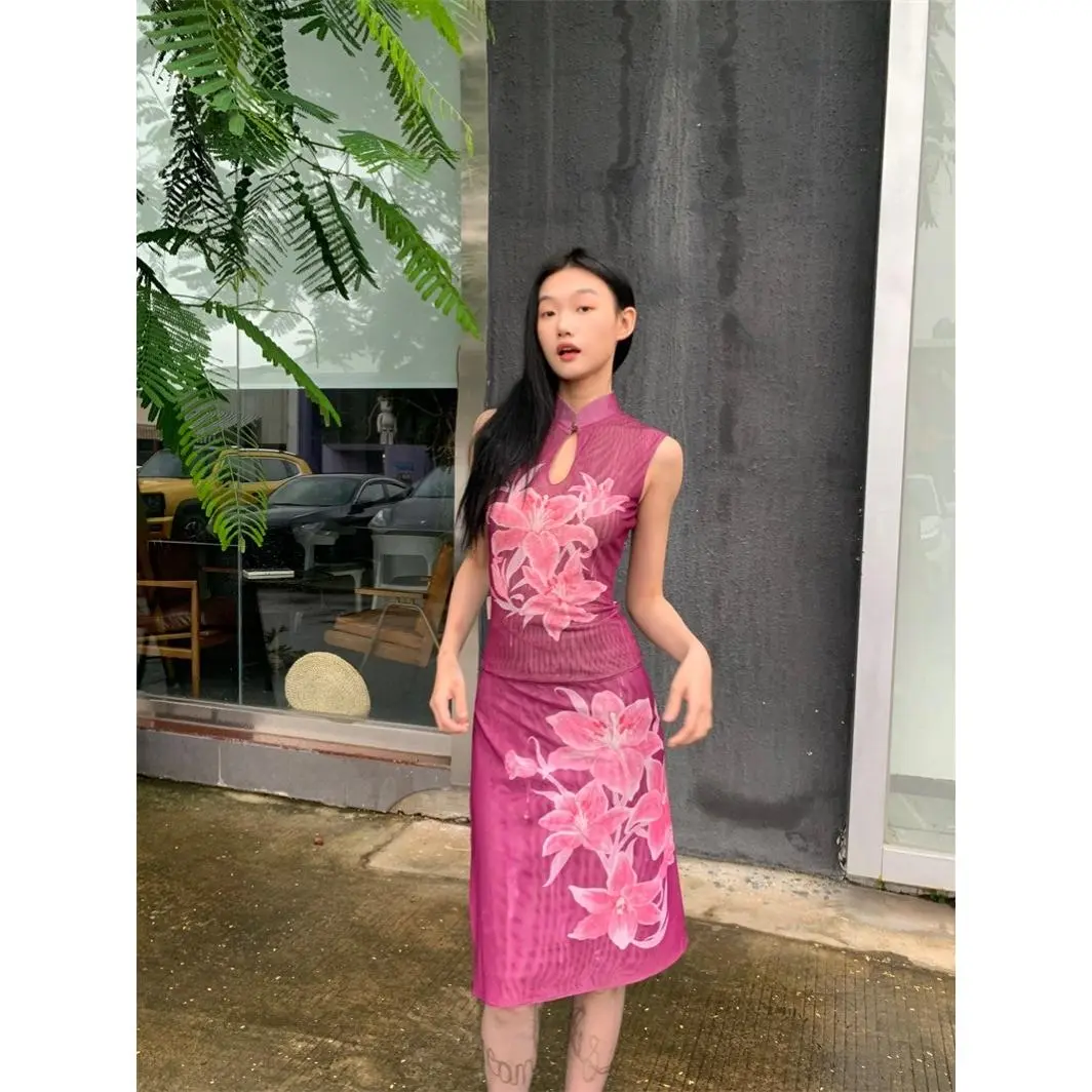New Chinese-style lily pattern reversible cheongsam top + new Chinese-style lily pattern reversible one-piece skirt