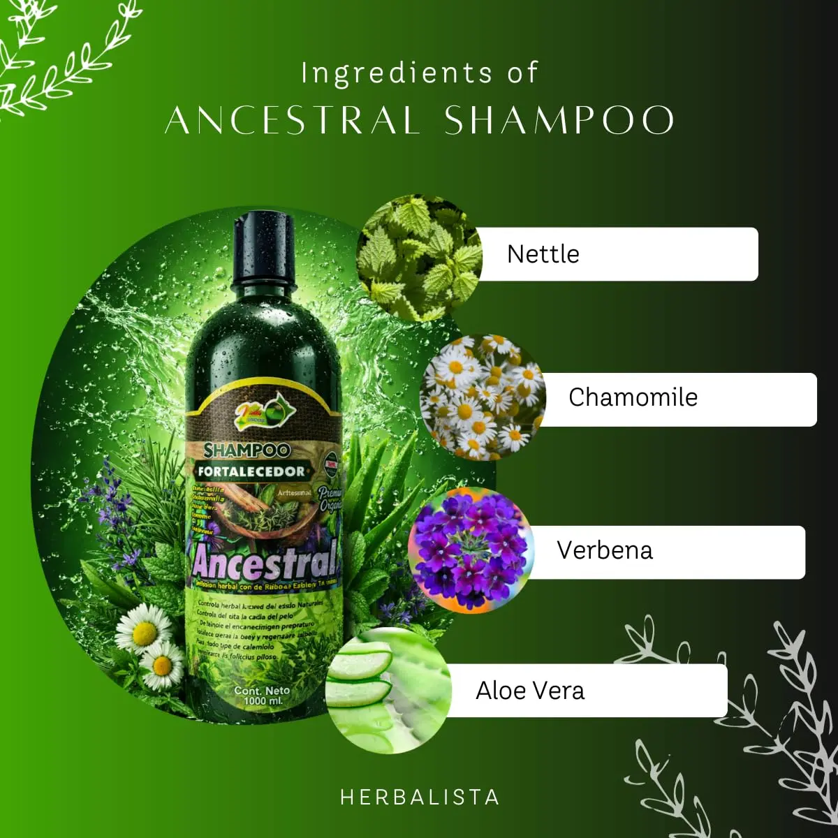 ·Shampoo Fortalecedor Ancestral 🌿 Botanical Formula: Inspired by traditional herbal practices, this shampoo features Espinosilla, Ginkgo Biloba, Chamomile, Rosemary, Nettle, and Verbena. These ingredients cleanse, refresh, and revitalize hair.