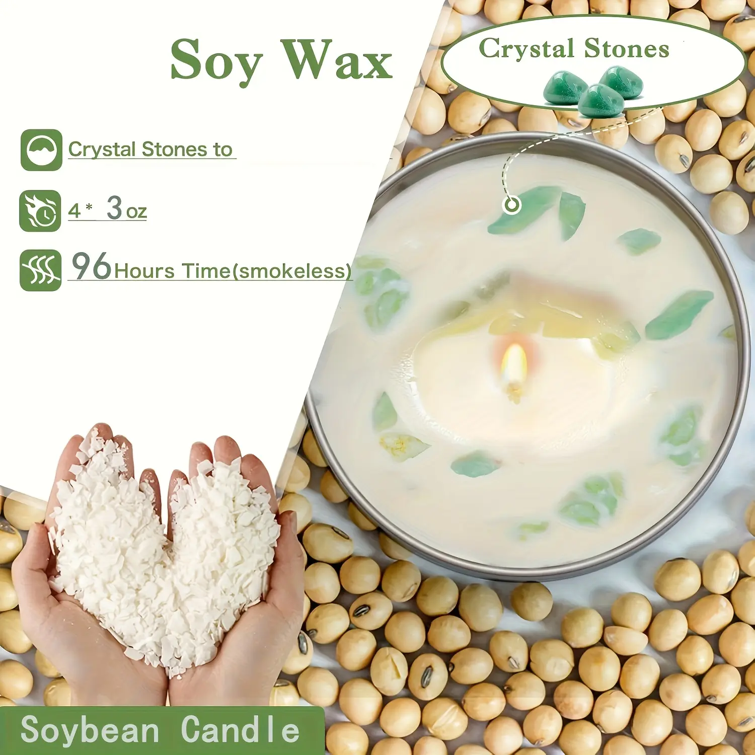 Material: Natural soy wax, cotton wick, crystal chips, metal tin