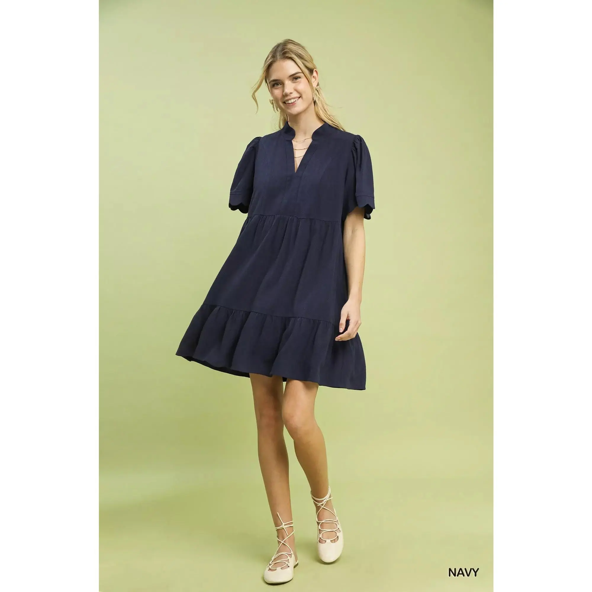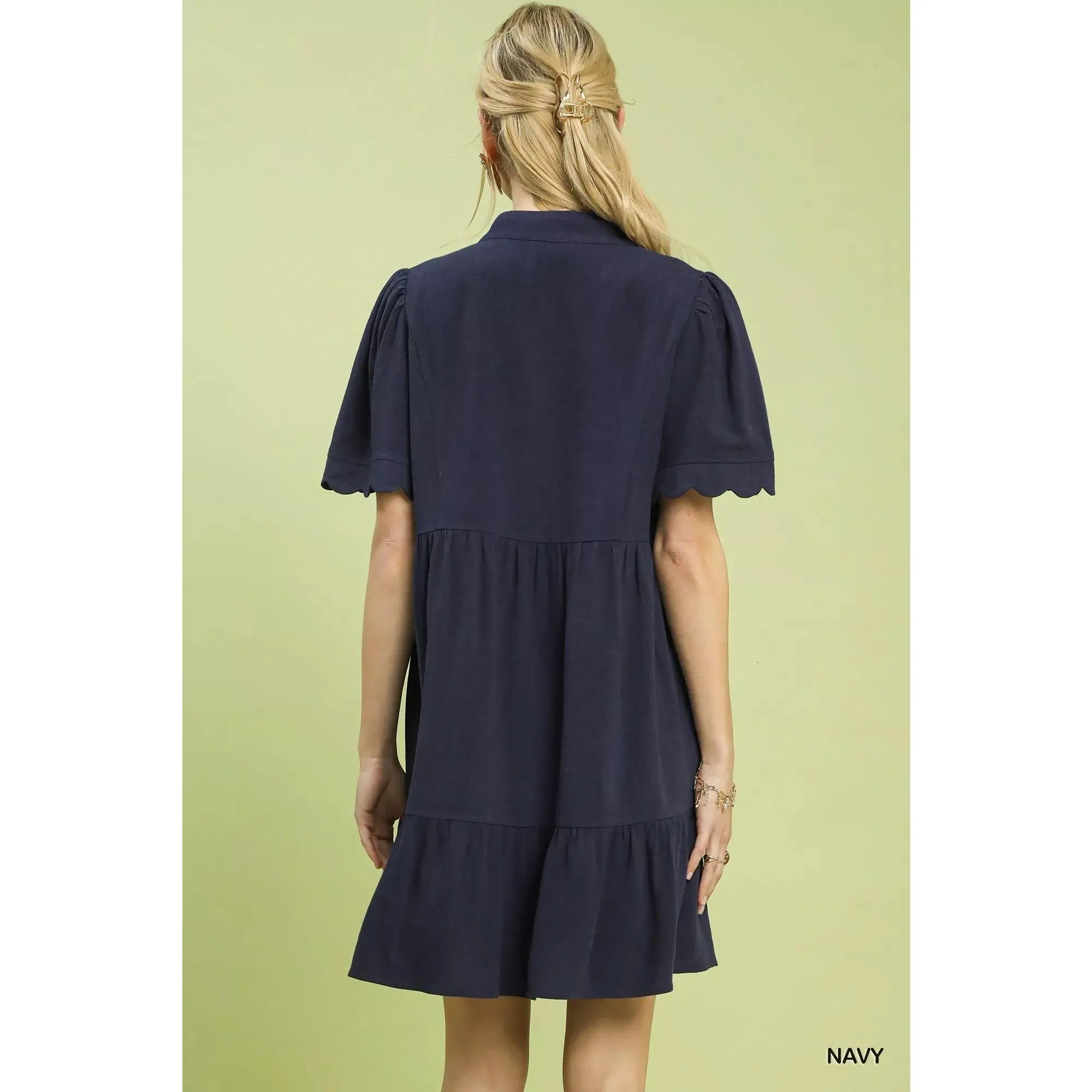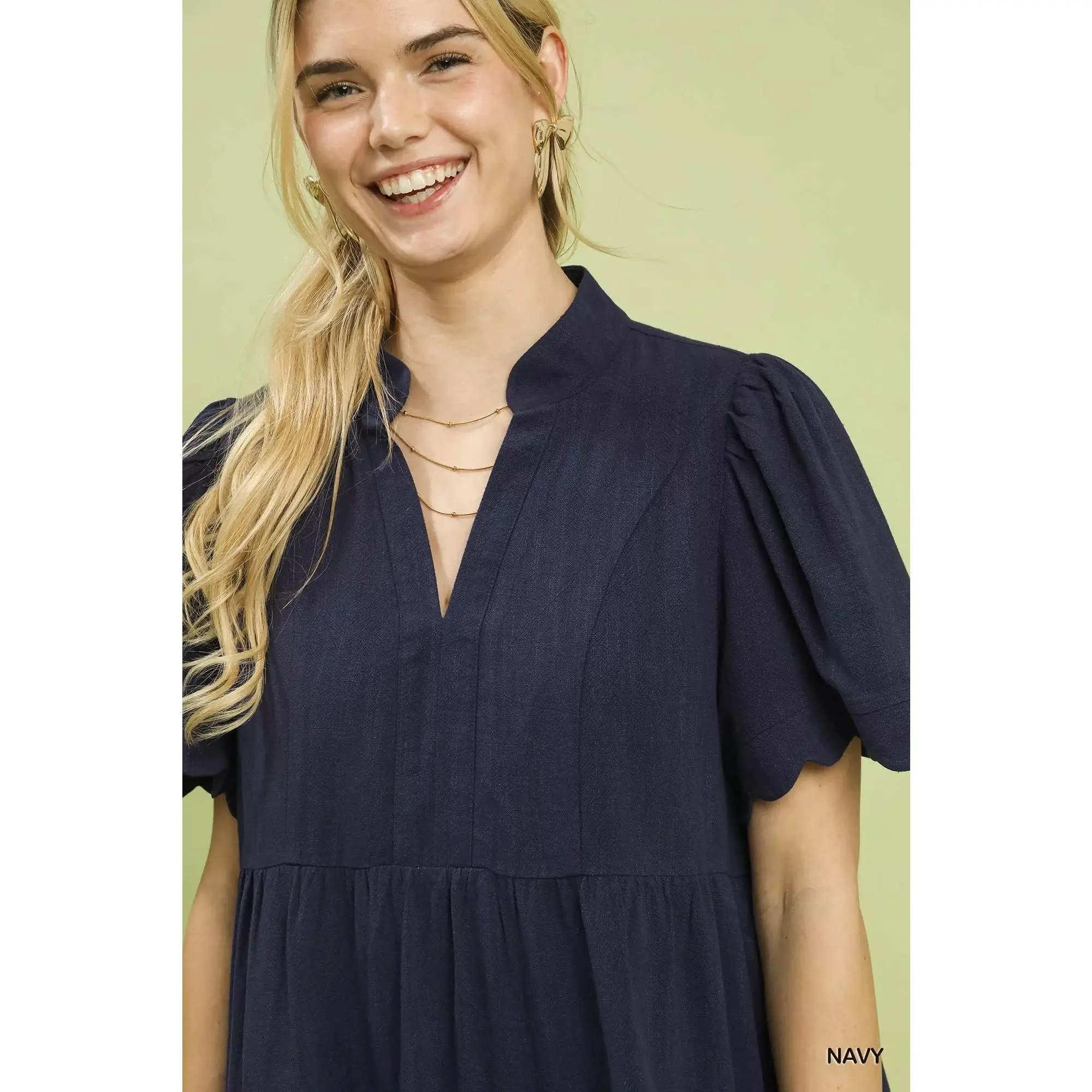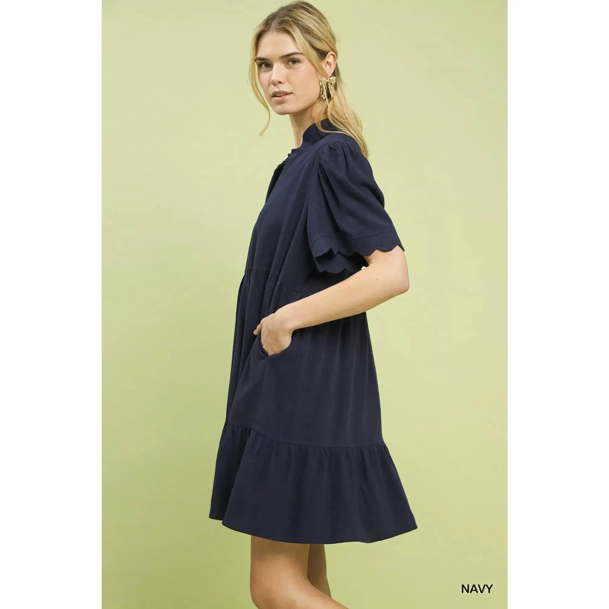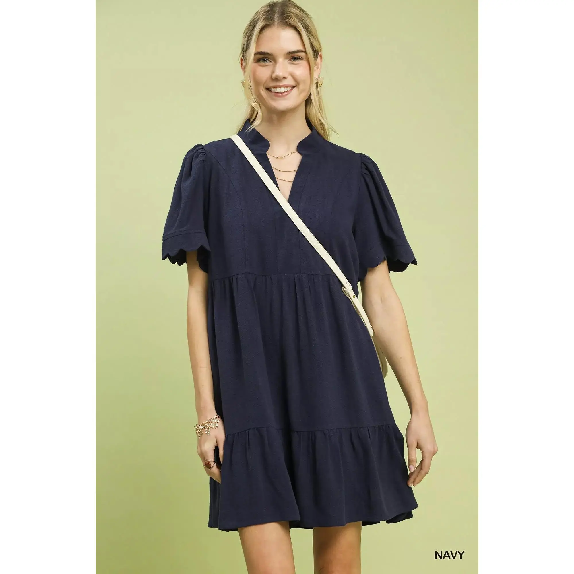 This linen tiered babydoll dress is a versatile and stylish choice, featuring a split V-neck and short scalloped sleeves for a feminine touch. The practical pockets add functionality to the design, while the lining enhances comfort and coverage. Perfect for a casual and effortless look, the dress combines comfort with chic style. The tiered silhouette adds dimension and movement to the outfit, making it a flattering and easy-to-wear option for various occasions. Ideal for a relaxed and fashionable ensemble that exudes charm and comfort.