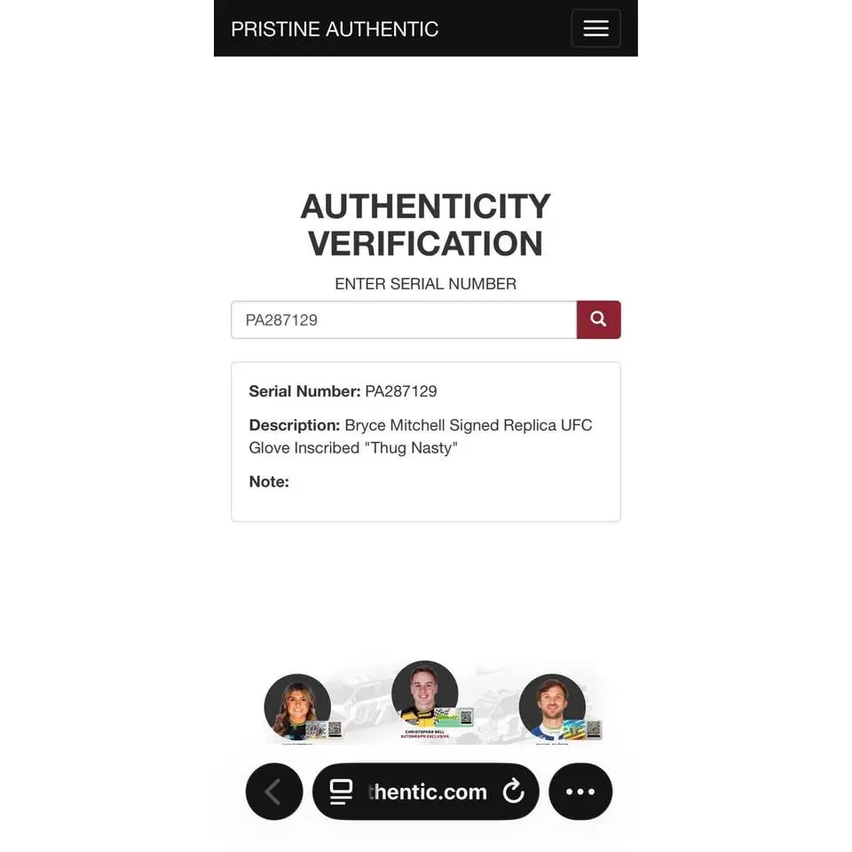 🔢 Certification #: PA287129 Authentication confirms: “Bryce Mitchell Signed Replica UFC Glove Inscribed ‘Thug Nasty’”