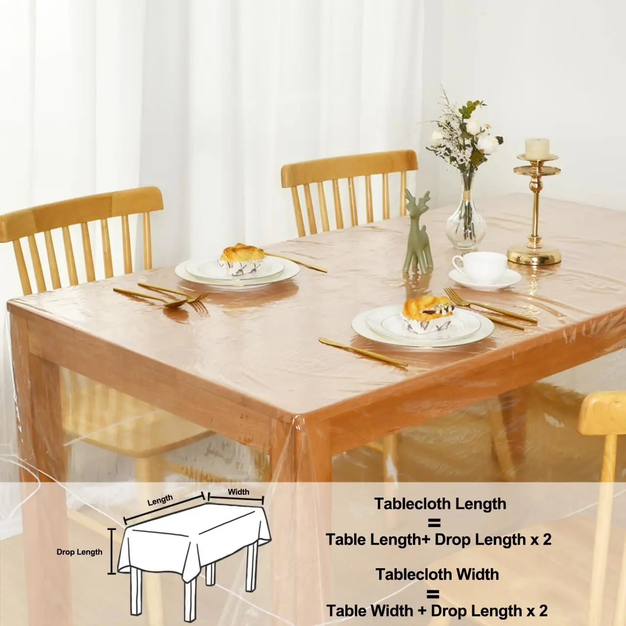 Premium Clear PVC Table Cloth: Our tablecloth is crafted from premium clear PVC material, featuring a neatly sewn edge for an elegant finish.Available in various sizes to fit different table dimensions, clear tablecloth beautifully showcases your tabletopWaterproof&Stain-Resistant: PVC Crystal Clear plastic table cover protector tablecloth provides excellent protection against spills, stains, and scratches, keeping both your table and elegant tablecloth looking pristine and extending their lifespanReusable Design: Clean clear vinyl tablecloth protector designed for repeated use,this transparent clear table cover tablecloth is perfect for frequent gatherings, family dinners, and events, helping you reduce waste and save money on disposable tableclothVersatile for Multiple Occasions: Whether it's indoor dinners, weddings and parties, or outdoor picnics, barbecues, and camping, this clear plastic table cloth adapts effortlessly to any setting.Tablecloth versatility makes it a good choice for all eventsEasy to Clean: Plastic table cover protector can simply be wiped with a damp cloth. Note, Clear Tablecloth should not be machine washed, bleached, or ironed. Slight creases upon arrival are normal and can be smoothed out with a hairdryer or by laying flat