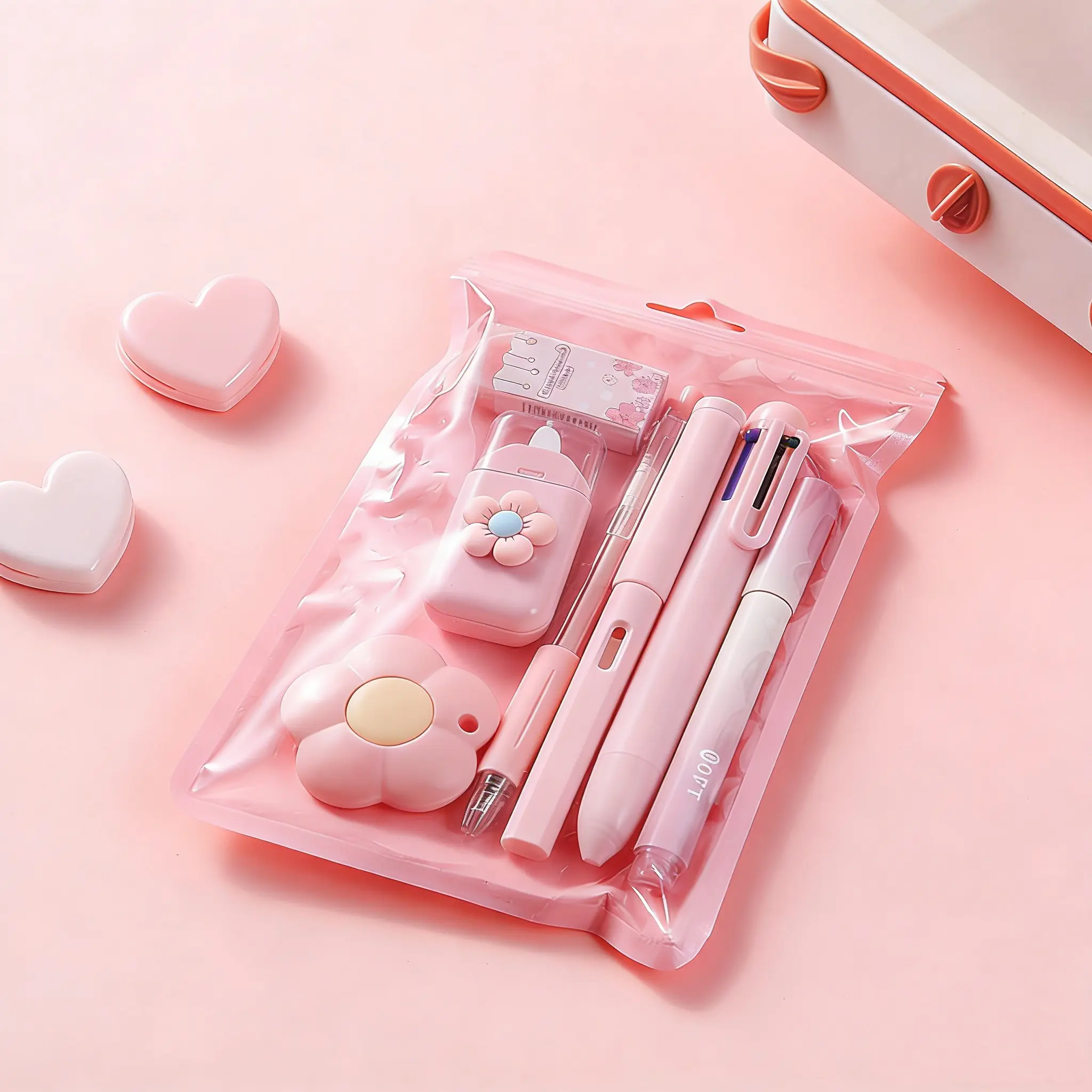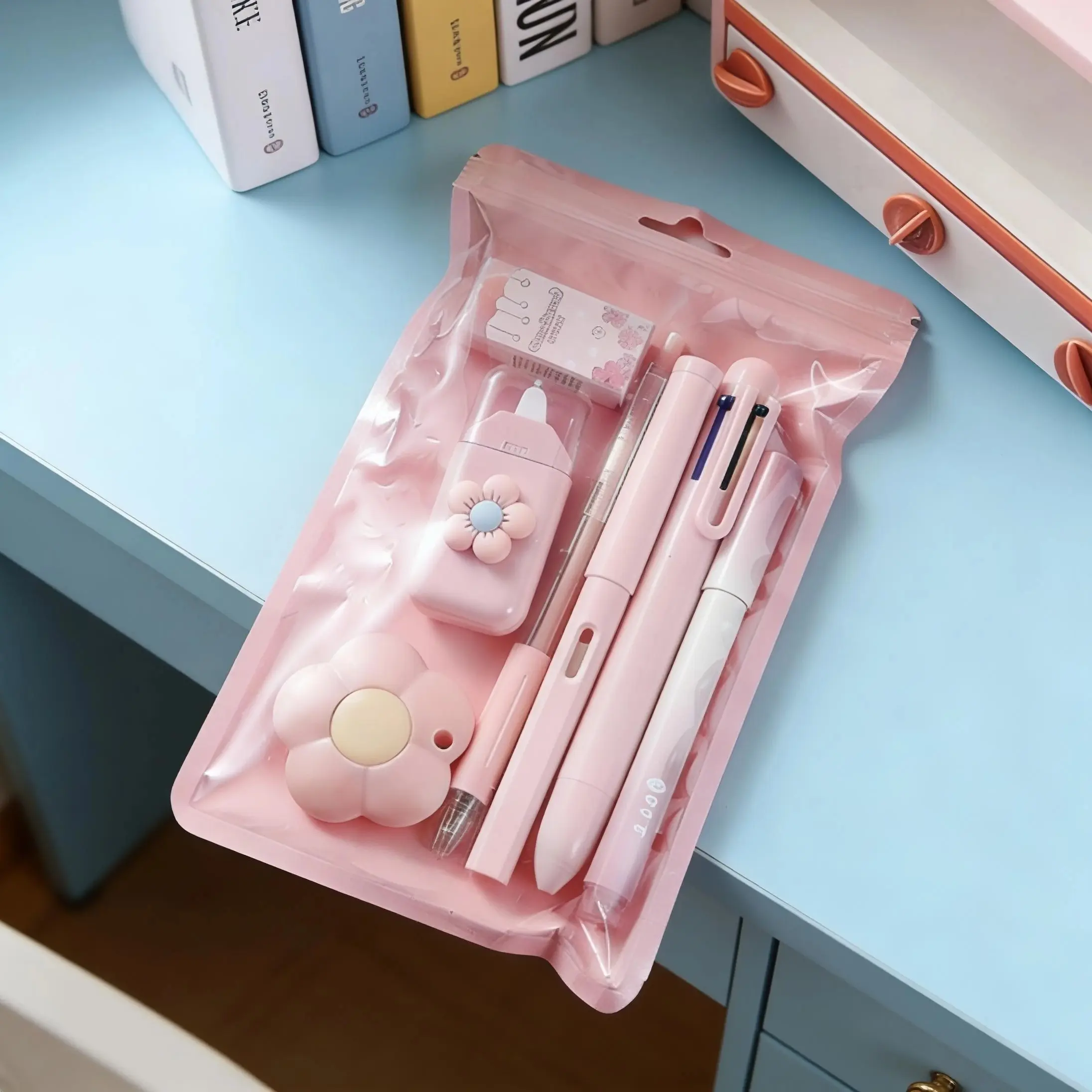 7 Pcs Cute Pink Stationery Set: Kawaii School Supplies Office Supplies Including: 6-in 1 Ballpoint Pen, Retractable Gel Pen, Eternal Pencil, Highlighter, Eraser, Correction Tape, Utility Knife. A great add-on to school supplies, office desk supplies, pen pal kit. (Note: Includes a small KNIFE. )