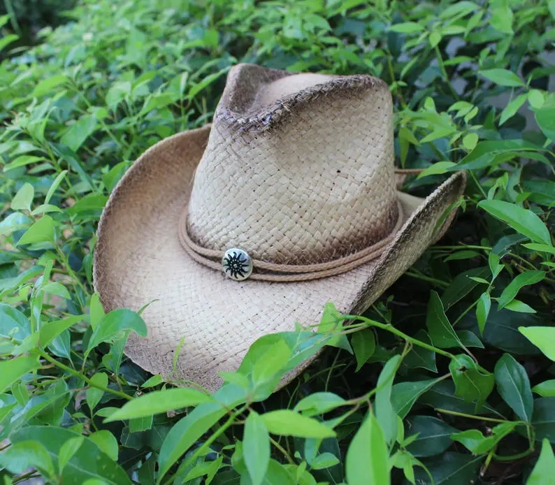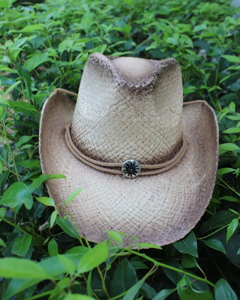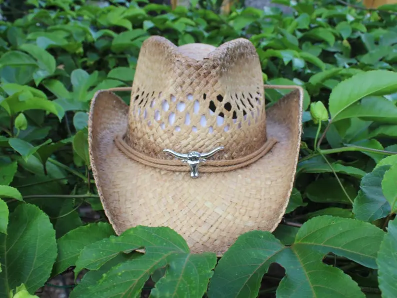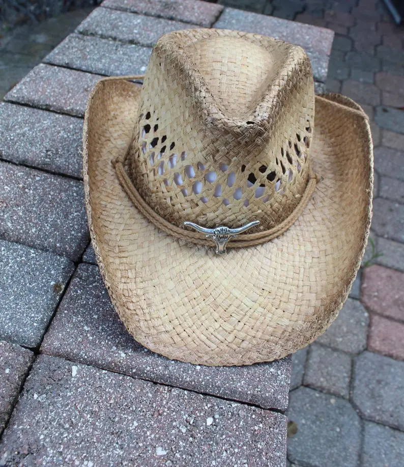 Handwoven Raffia Straw Cowboy Hat: Outback Western Style with Longhorn