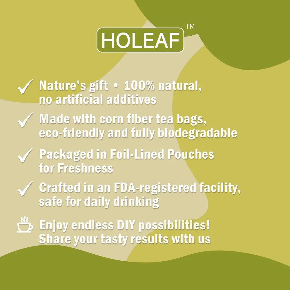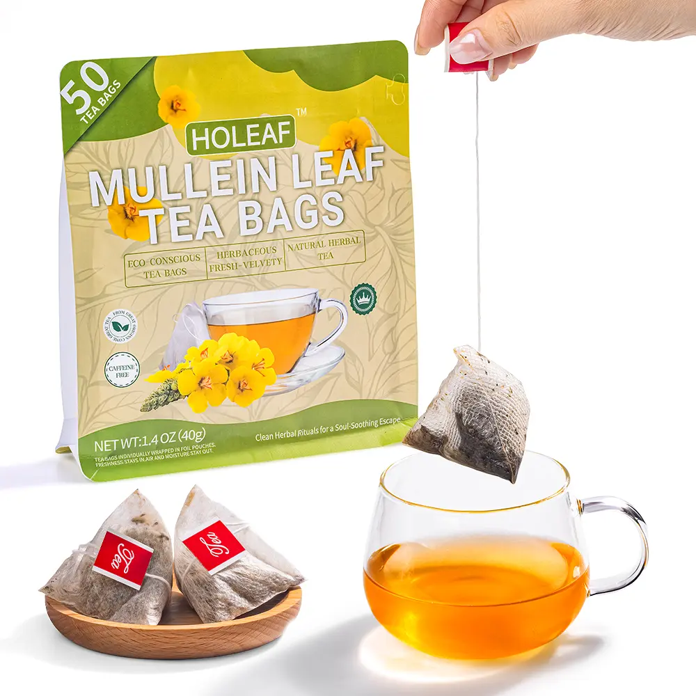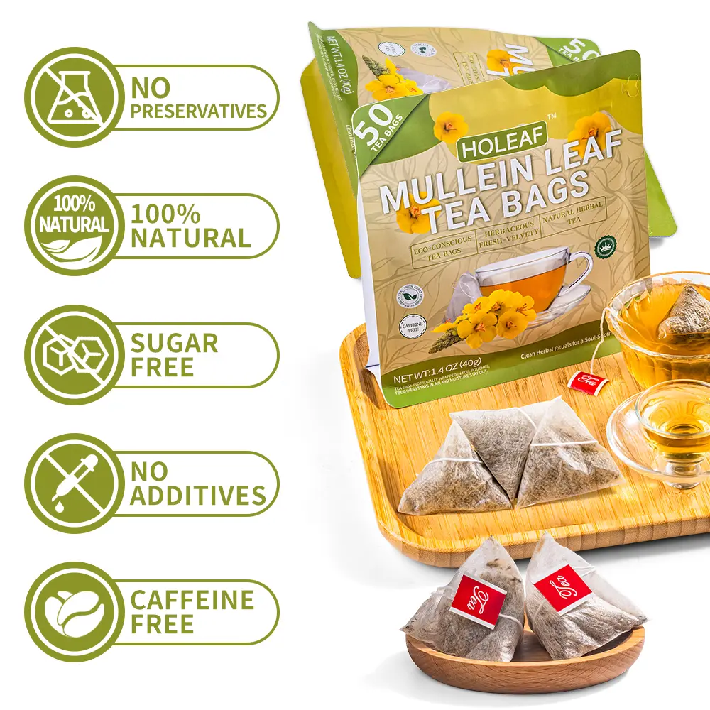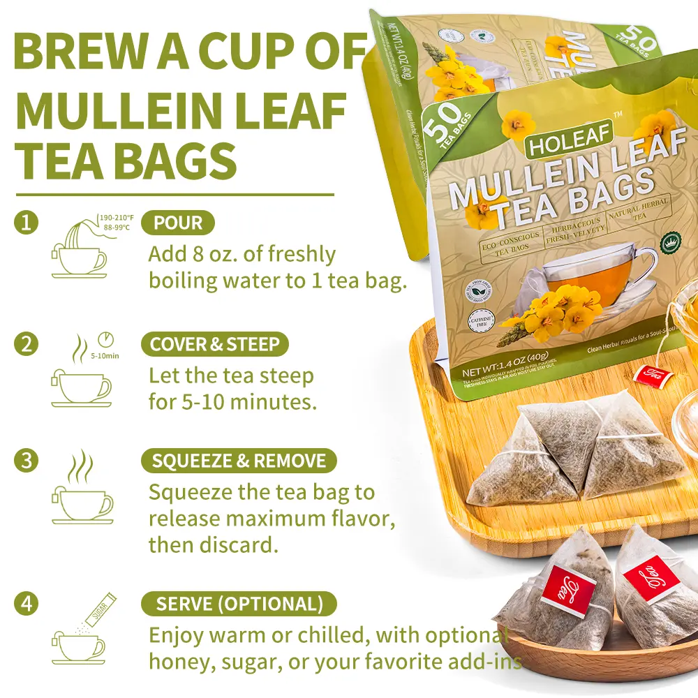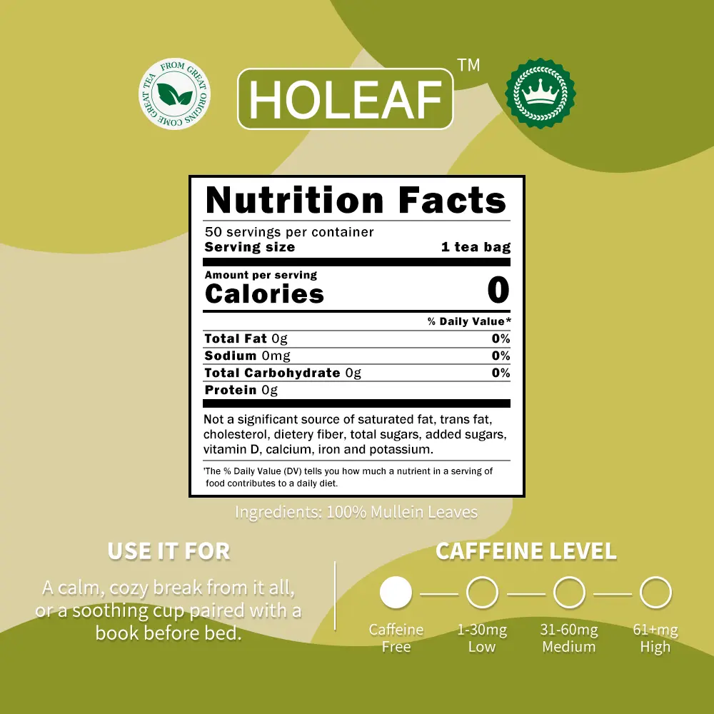HOLEAF Mullein Leaf Tea: Your go-to gentle wellness sip for daily comfortCrafted with premium 100% natural mullein leaves—caffeine-free, no additives or harsh chemicals, so it’s gentle for all-day sipping (morning routines, office breaks or late-night wind-downs). Each tea bag is foil-sealed to lock in fresh mild herbal flavor, with eco-friendly packaging that fits mindful modern living. Great for throat comfort and respiratory support, it’s perfect for busy pros, students and anyone craving a natural soothing drink. 50 tea bags per box for long-lasting value, crafted by HOLEAF where simple, natural wellness is accessible to everyone.