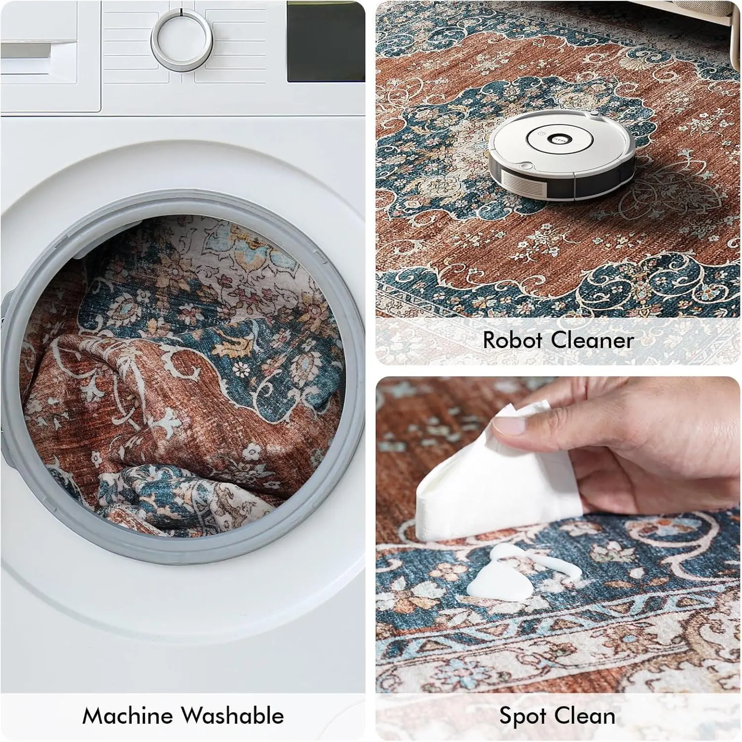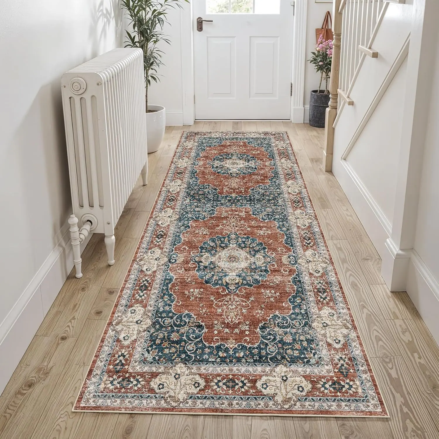 Machine Washable & Easy Care: Designed for busy households,the washable runner rugs maintain vibrant colors after repeated washing.Simply toss in the laundry room washing machine for easy cleaning - ideal for bedroom, living room or high-traffic hall that need frequent refreshing.Everyday messes can be quickly addressed with a robot vacuum, broom, or damp cloth.Plush Comfort Underfoot: Experience cloud-like softness underfoot with our plush yet practical runner rugs for bedroom.The gentle surface keeps feet warm and relaxed, while the ultra-thin design lies flat to prevent tripping hazards and fits seamlessly under furniture.Kid & Pet Friendly Design: Our 2x6 runner rugs are crafted with premium materials that are safe for children and pets to play on.The low-profile, short-pile construction prevents food crumbs and pet hair from becoming trapped, making maintenance simple and stress-free.Built for High-Traffic Areas: Engineered for durability with stain-resistant, non-shedding materials that withstand active households.Whether placed in hallways, entryways, or play areas, this non slip runner rug maintains its beauty.Features a classic Vintage design with a unique Seal pattern to enhance your home's decor.Non-Slip Backing: The thermoplastic rubber backing provides superior grip to keep your runners for hallways firmly in place on floor surface.Note: Due to shipping, 2x6 rug may arrive with temporary creases that will naturally flatten when unrolled (recommend allowing 24-48 hours).