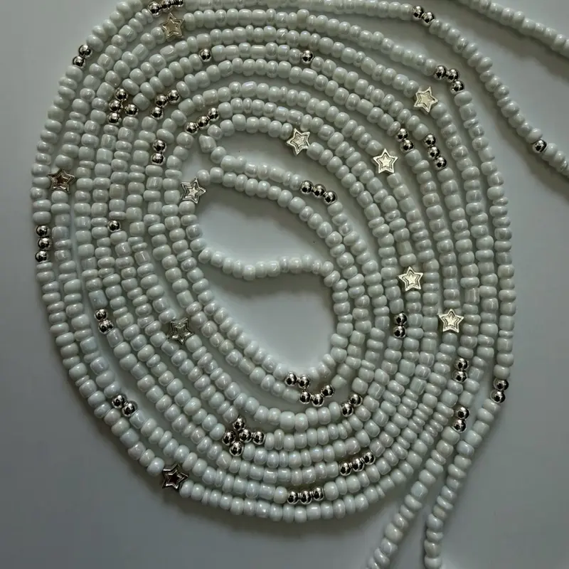 Elevate your look with this elegant 60-inch waist bead, featuring Princess, A delicate white glass beads accented with an inspired design and refined gold and silver details. Designed to enhance your natural beauty, this piece offers a timeless and graceful aesthetic.