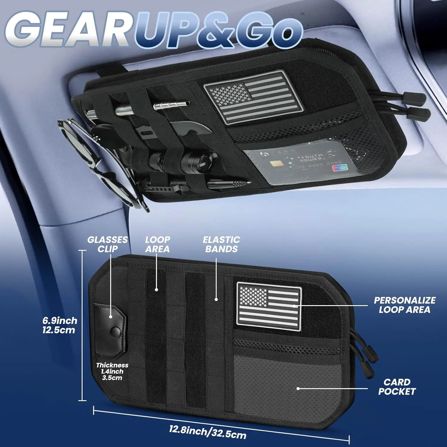 Molle Visor Organizer for Car, 1000D Polyester Tactical Panel Sun Glasses Holder with Zipper Pockets, Adjustable Straps for SUV Truck Pickup Patrol Car Sto