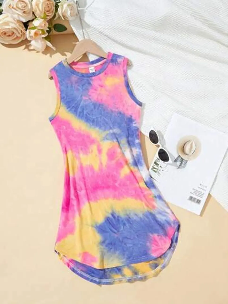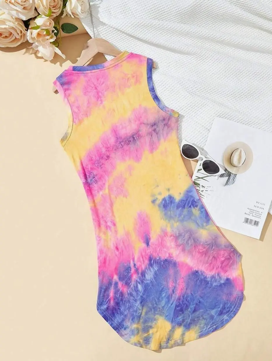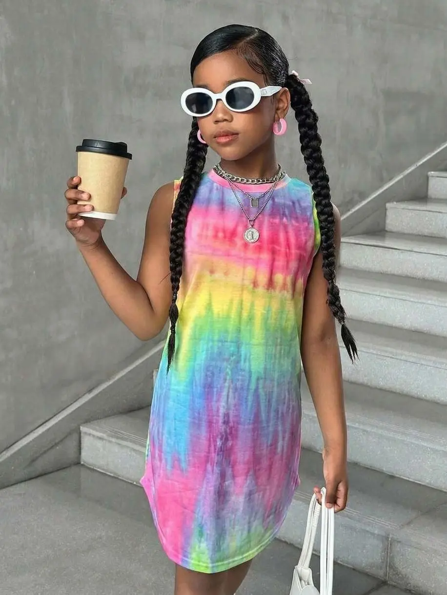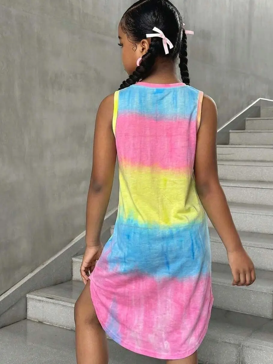 Girl's Casual Streetwear Spring/Summer Sleeveless Knit Tie-Dye Round Neck Dress