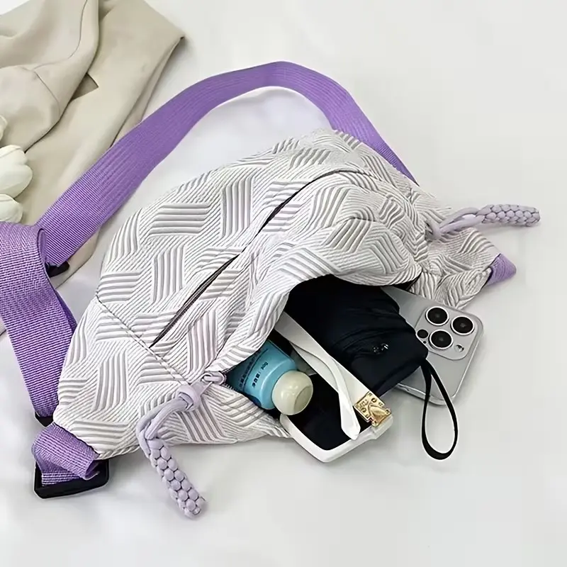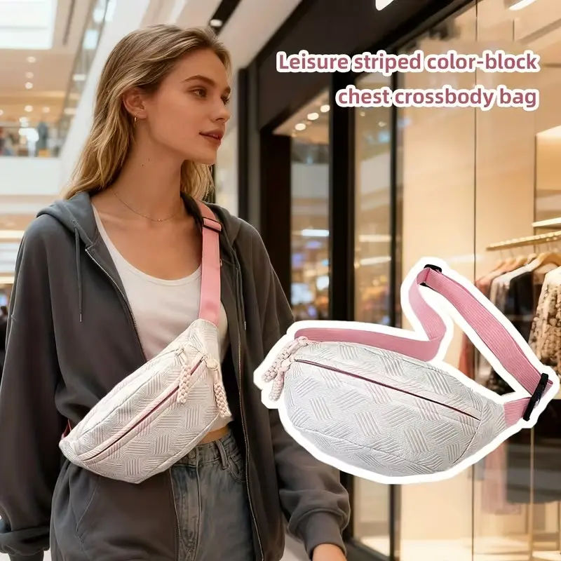This striped crossbody chest sack is perfect for hands-free convenience. It features a zipper closure and a phone holder, ideal for smartphones. Designed for travel, shopping, and gym use, it offers versatile functionality. The bag is a hands-waist accessory, enhancing mobility and ease of use.