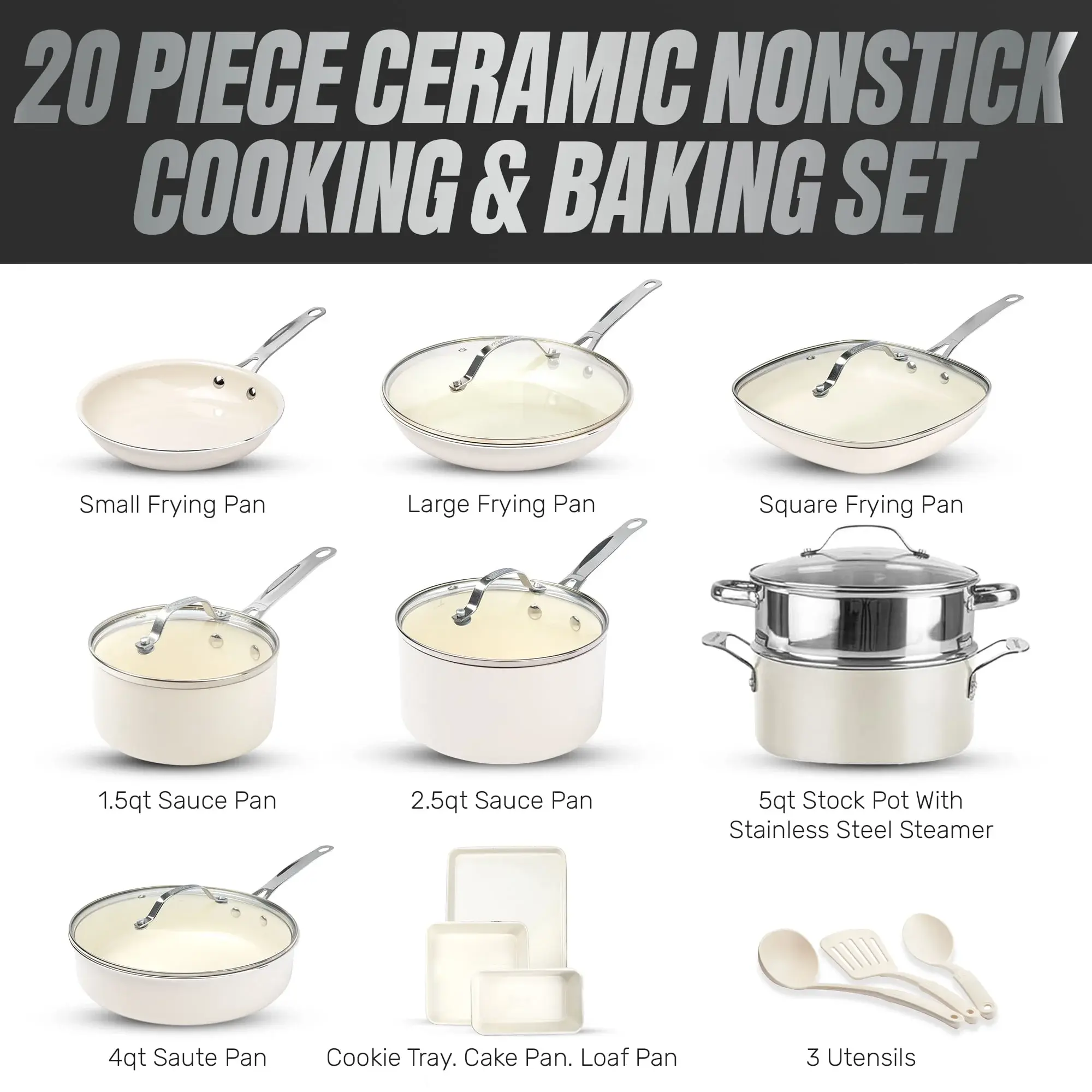 ·WHAT'S INCLUDED: 8.5" Fry Pan, 10.25" Fry Pan with Lid, 9.5" Square Pan with Lid, 1.5Qt Saucepan with Lid, 2.5Qt Saucepan with Lid, 5Qt stock Pot with Lid & Stainless Steel Steamer, 4 Qt Jumbo Cooker with Lid, 3 Baking pans, 3 Utensils