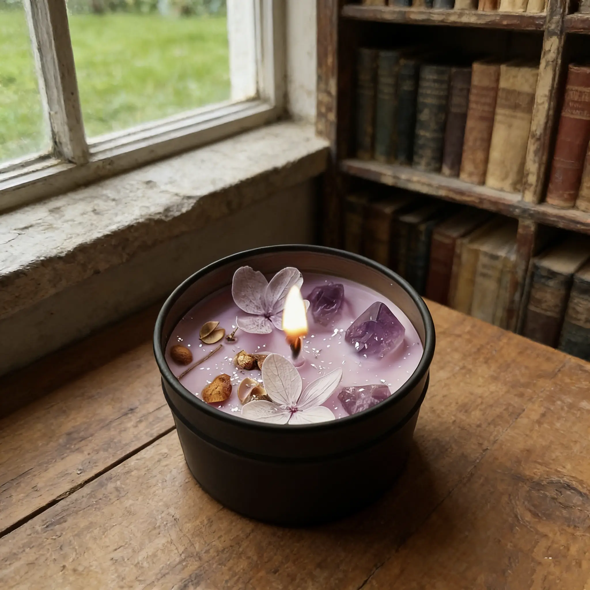 Material: Natural soy wax, cotton wick, amethyst crystals, dried flowers, metal tin