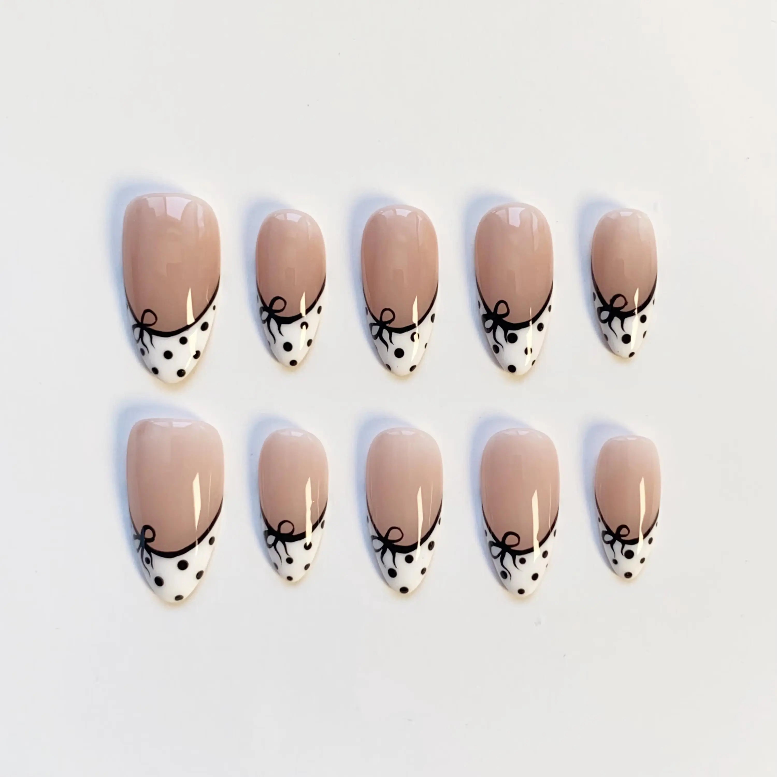 COQUETTE DOTS | White French Polka Dot Press On Nails | Cute Black Bow Fake Nails | Vintage Soft Girl Aesthetic | Custom Handmade Almond Set 2026