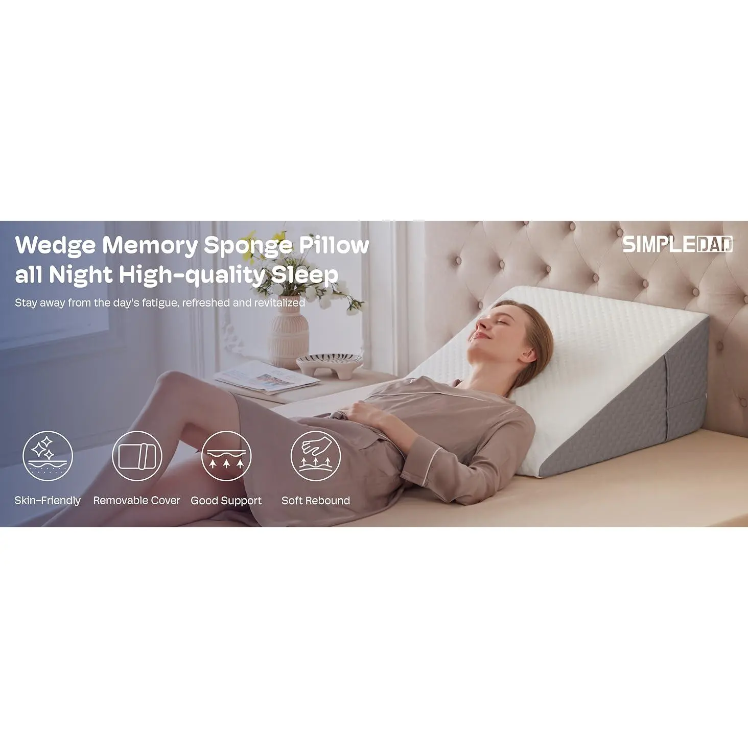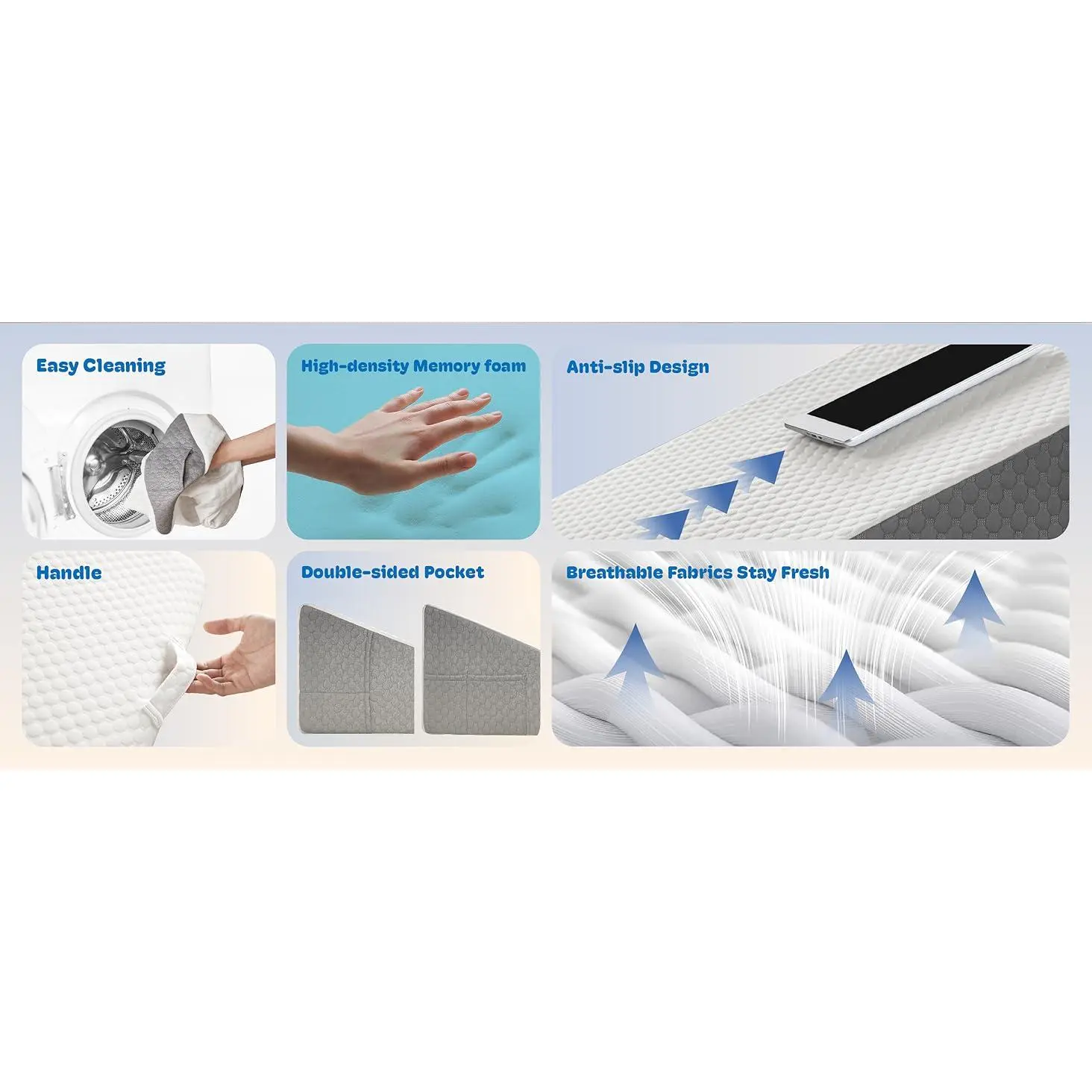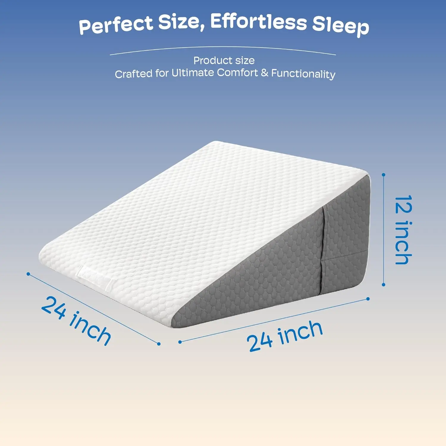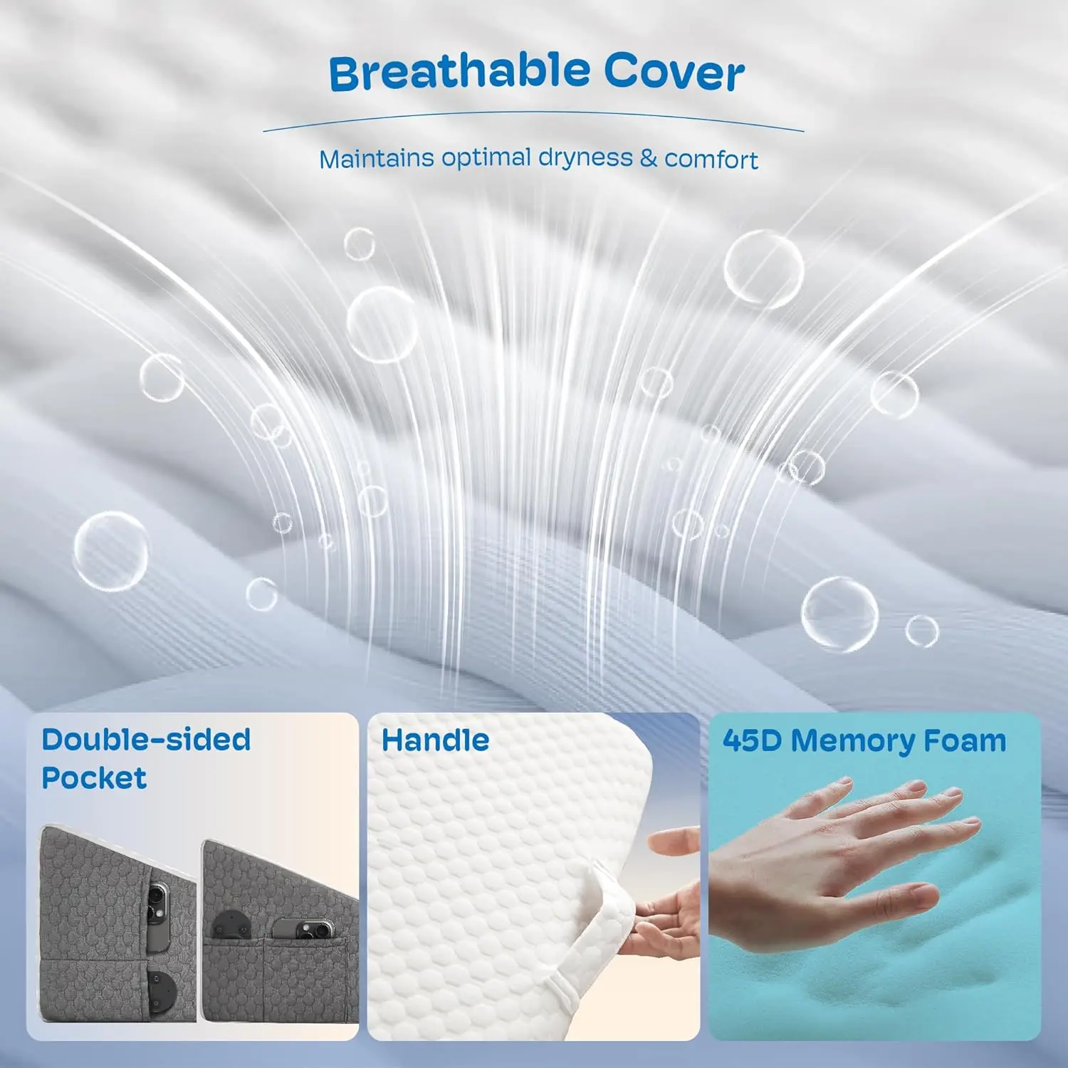 PORTABLE WEDGE PILLOW FOR BACK PAIN RELIEF: Portable carry handle for easy repositioning.Dual side pockets are designed to hold your glasses, remote control, mobile phone, and other belongings, so you don't have to worry about waking up and not being able to find them.MULTIPLE USAGE SCENARIOS: It's not just a bed wedge, but also a back pillow for bed sitting up or on the couch.It is the perfect companion for reading, using your phone, working, watching TV, or simply relaxing.SUPER COMFORTABLE WEDGE PILLOW: Features 45D cooling gel-infused memory foam on top, offering a soft and slow rebound that ensures every inch of your skin fits snugly against the wedge pillow headboard.It also includes 25D high-density premium foam for reliable support.Available in 7.5-inch and 12-inch heights to meet your different needs (24 x 24 x 7.5 or 24 x 24 x 12).MULTIPLE EFFECTS FOR ALL DISCOMFORTS: Are you still tired because you can't sleep well at night?This bed wedge pillow for sleeping also suitable for acid reflux relief (GRED), post-operative recovery, snoring, and heartburn.Additionally, it can help alleviate headaches, shoulder and neck pain, back pain, as well as leg and knee pain.Its mission is to make you more comfortable while resting or sleeping.QUALITY PILLOWCASE: The 280gsm fiber air layer pillow cover, combined with cooling gel-infused memory foam, keeps you dry and clean even on hot summer days. The anti-slip particle design ensures stability. Featuring a silky smooth zipper, the pillowcase can be easily removed and washed in the machine, making it simple to clean.Sleeping soundly throughout the night is the secret to staying energised the next day.