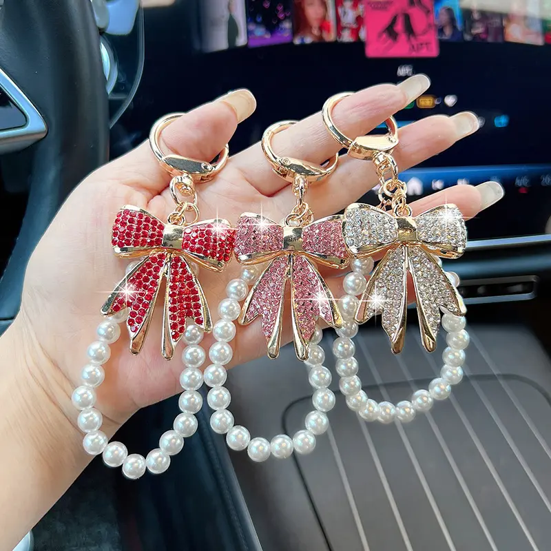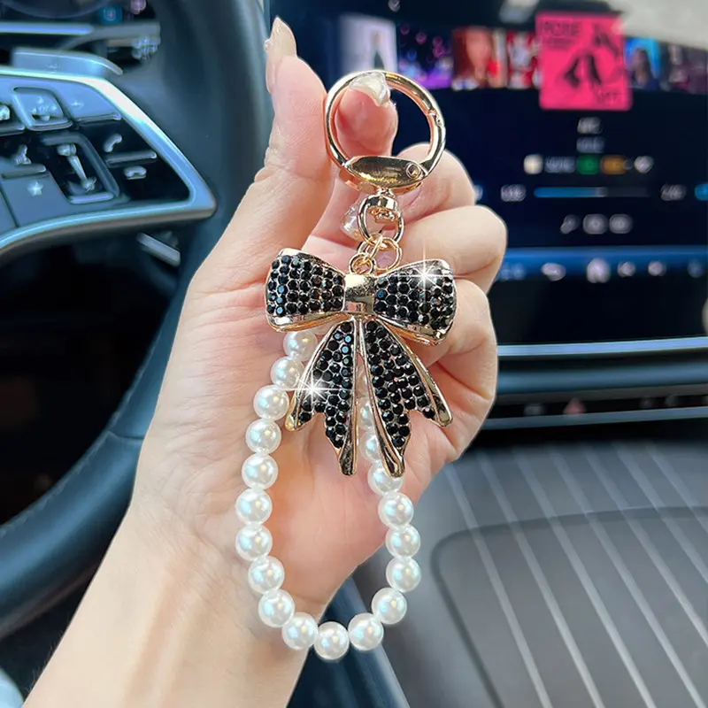 Rhinestone Bow Keychain with Pearl Wrist Strap, Luxury Bling Bow Car Key Ring, Elegant Metal Bag Charm Accessory for Women