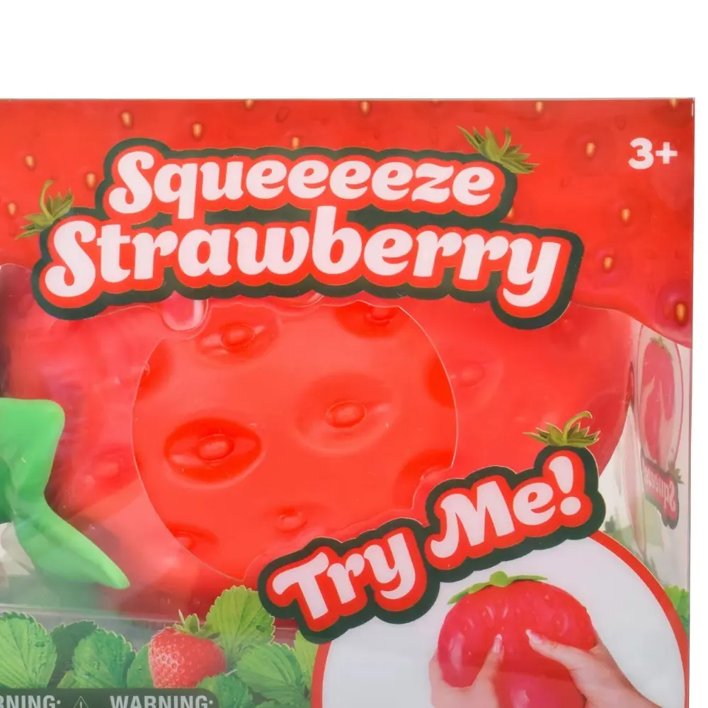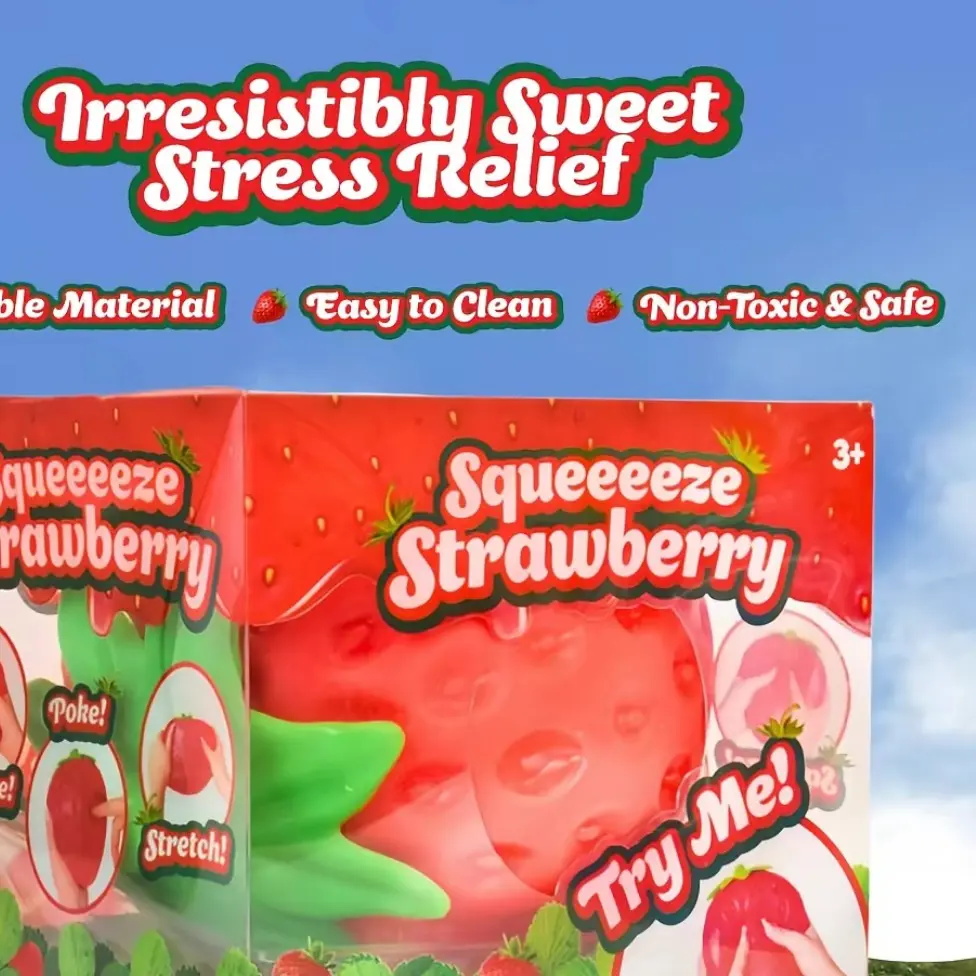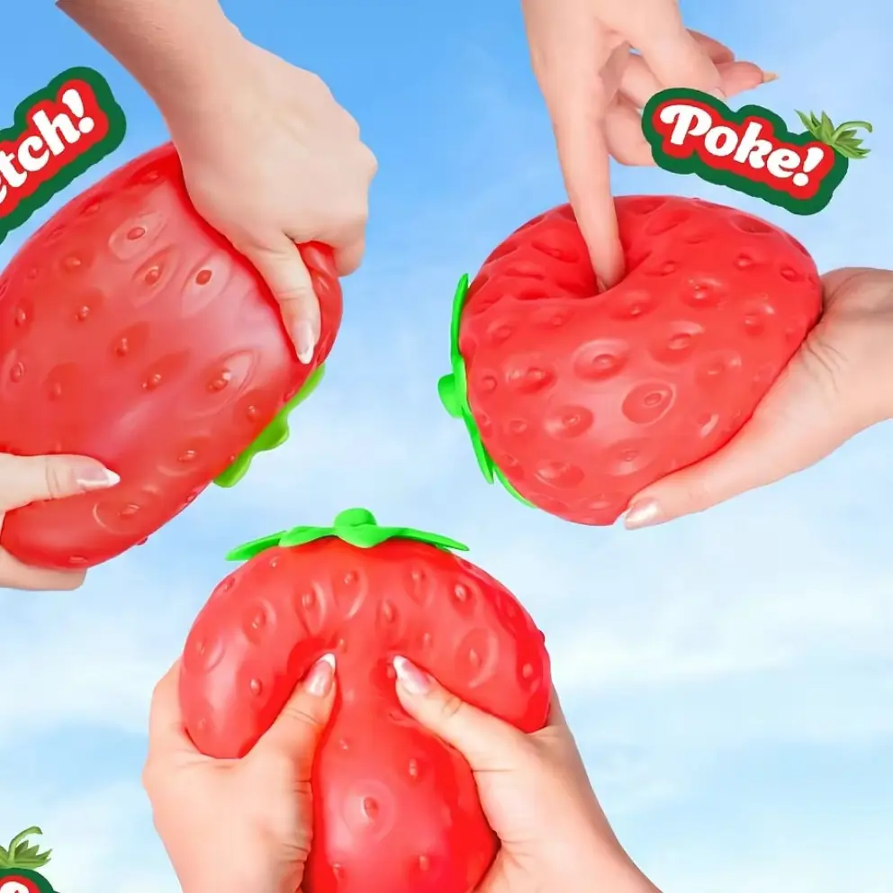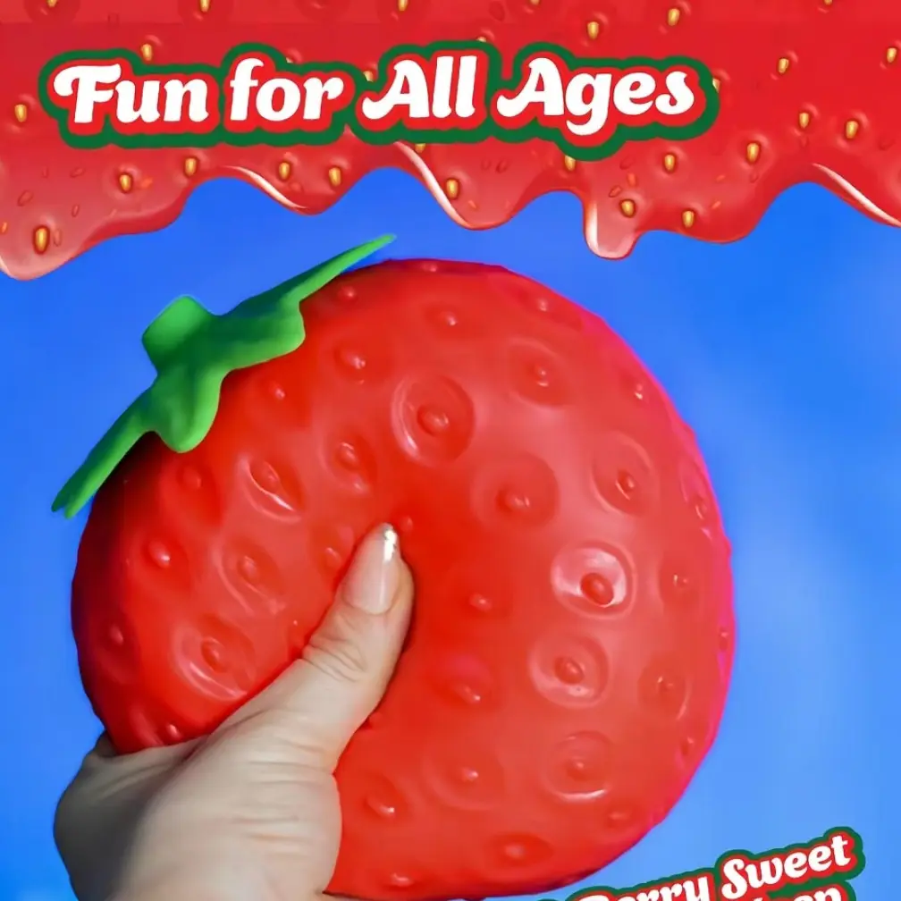 Features an oversized simulation strawberry design with distinct surface seeds and a vibrant red-and-green color palette, vividly recreating the texture of real fruit.