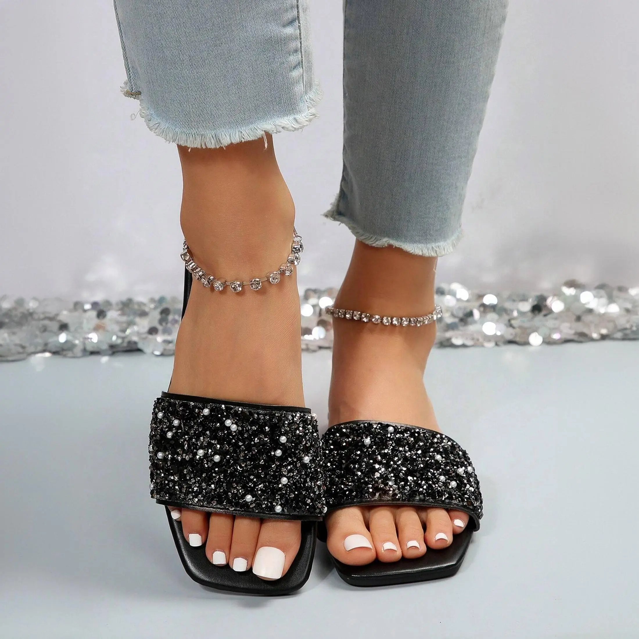 Women's Sparkly Sandals Flat Slides Dressy Rhinestone Square Open Toe Slip On Slippers Indoor Outdoor Shoes