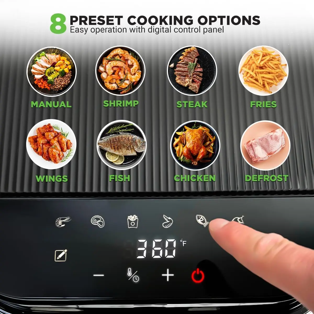 ·PRECISE COOKING RESULTS - Cook and air fry Shrimp, Steak, Fries, Wings, Fish, Chicken, and Defrost Cooking Presets. Ensure exact cooking results with adjustable temp control (up to 390°F) and timer settings (up to 60 minutes).