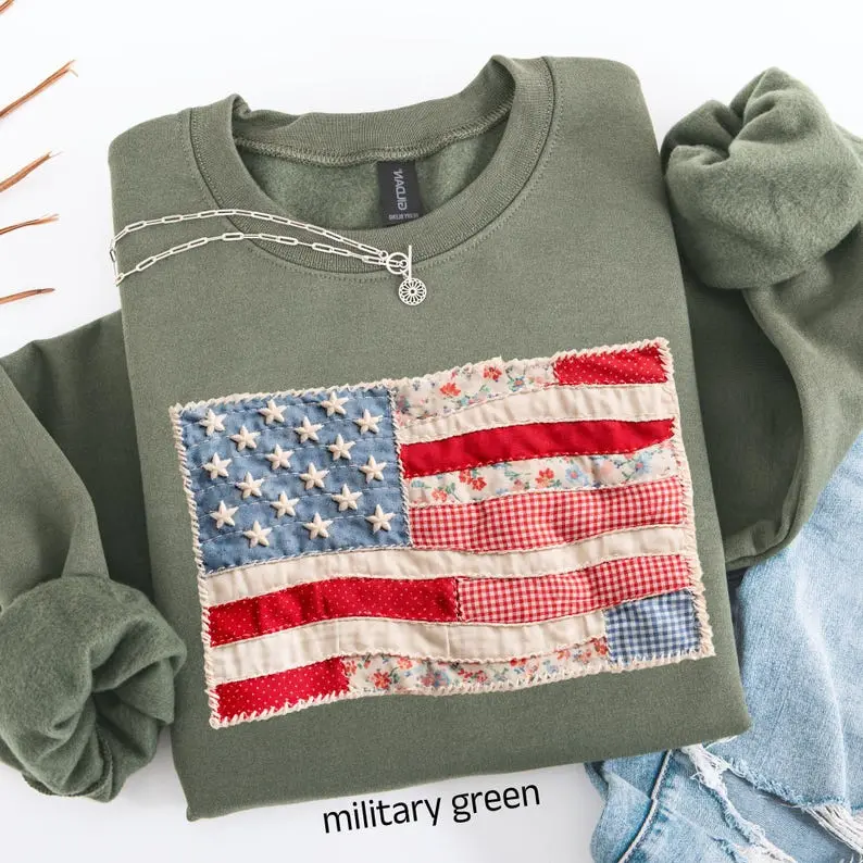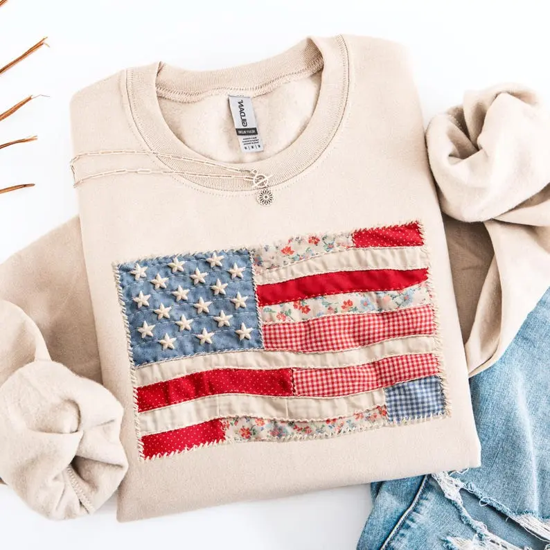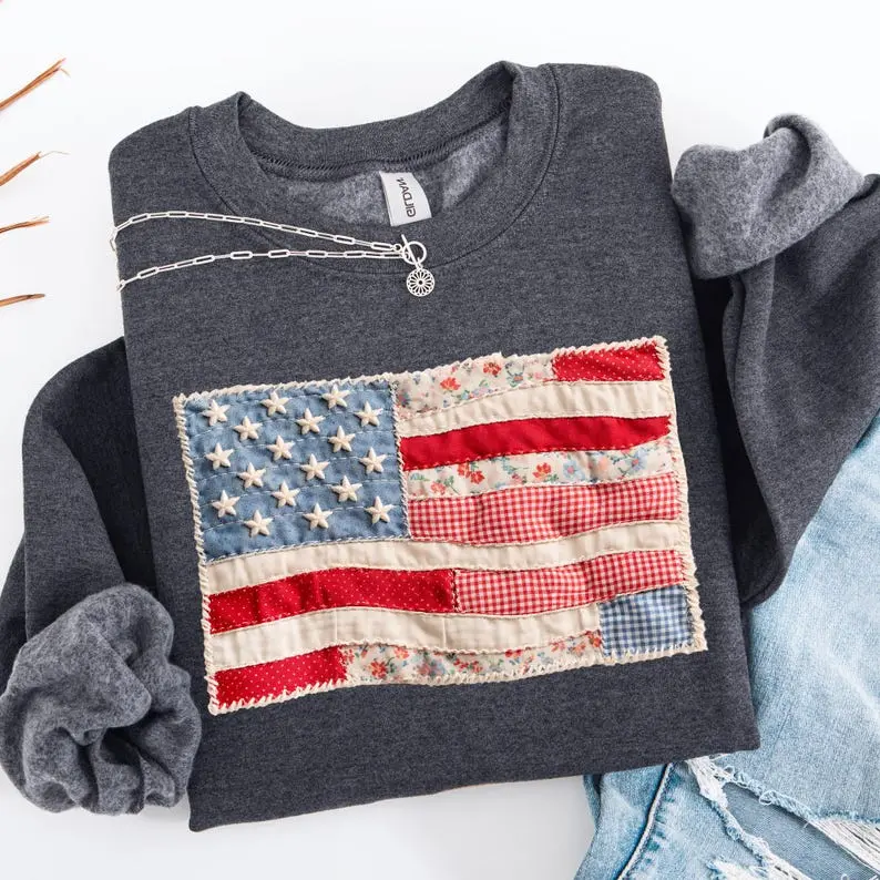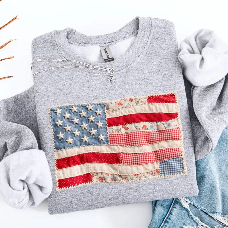 Perfect for Independence Day and Memorial Day, this retro-inspired crewneck features a unique faux quilted USA flag design — giving a cozy, handmade look without the bulk.