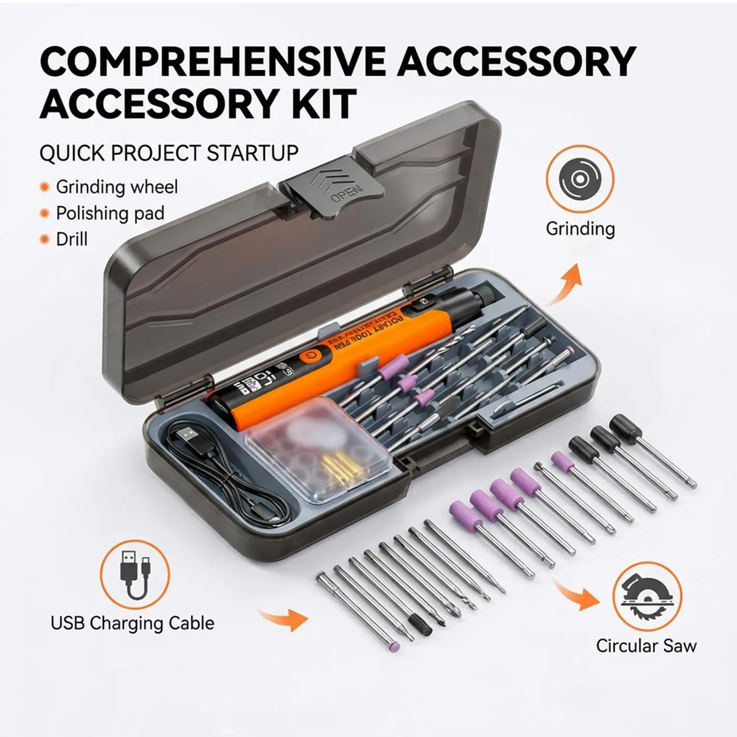 ·【Effortless & Long-lasting Usage】 The mini rotary tool features Type-C fast charging, a built-in LED work light and low-noise running. It also has overheat protection, making it perfect for prolonged DIY crafting and home projects.
