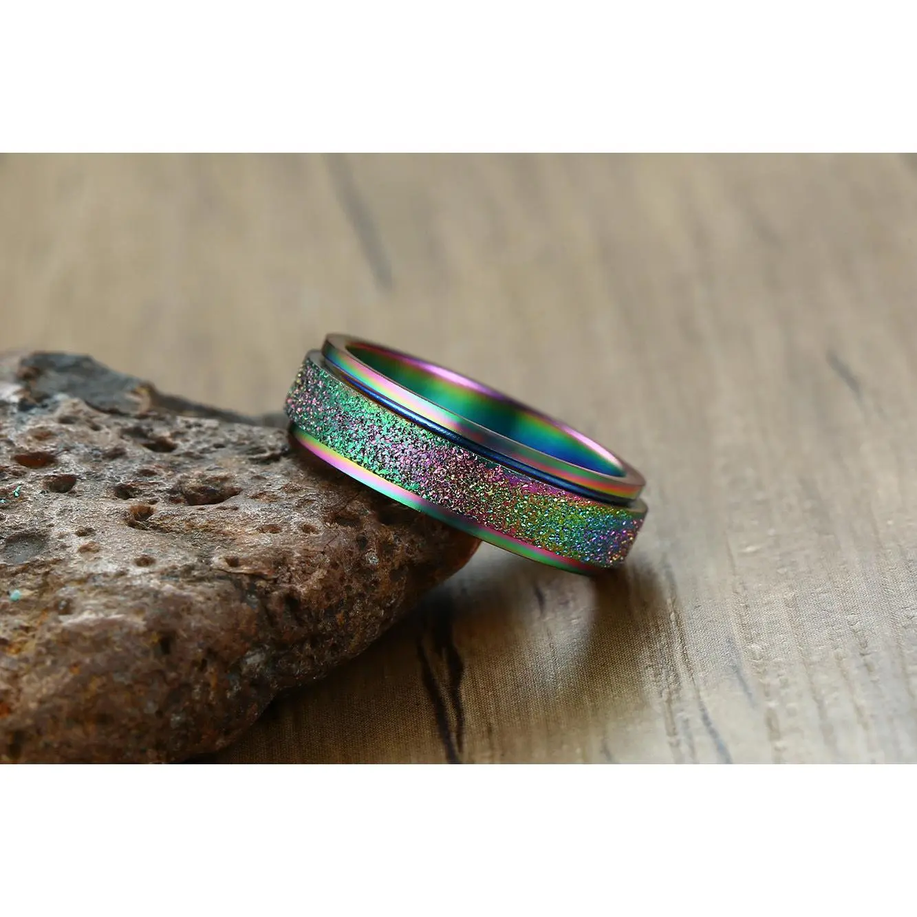 Upgrade your everyday style with this colorful sanded rotating ring. Designed with a smooth matte finish, it delivers a soft, premium feel while the outer band spins effortlessly for a satisfying, calming motion. The vibrant color-shifting design catches light from every angle, making it both eye-catching and functional.