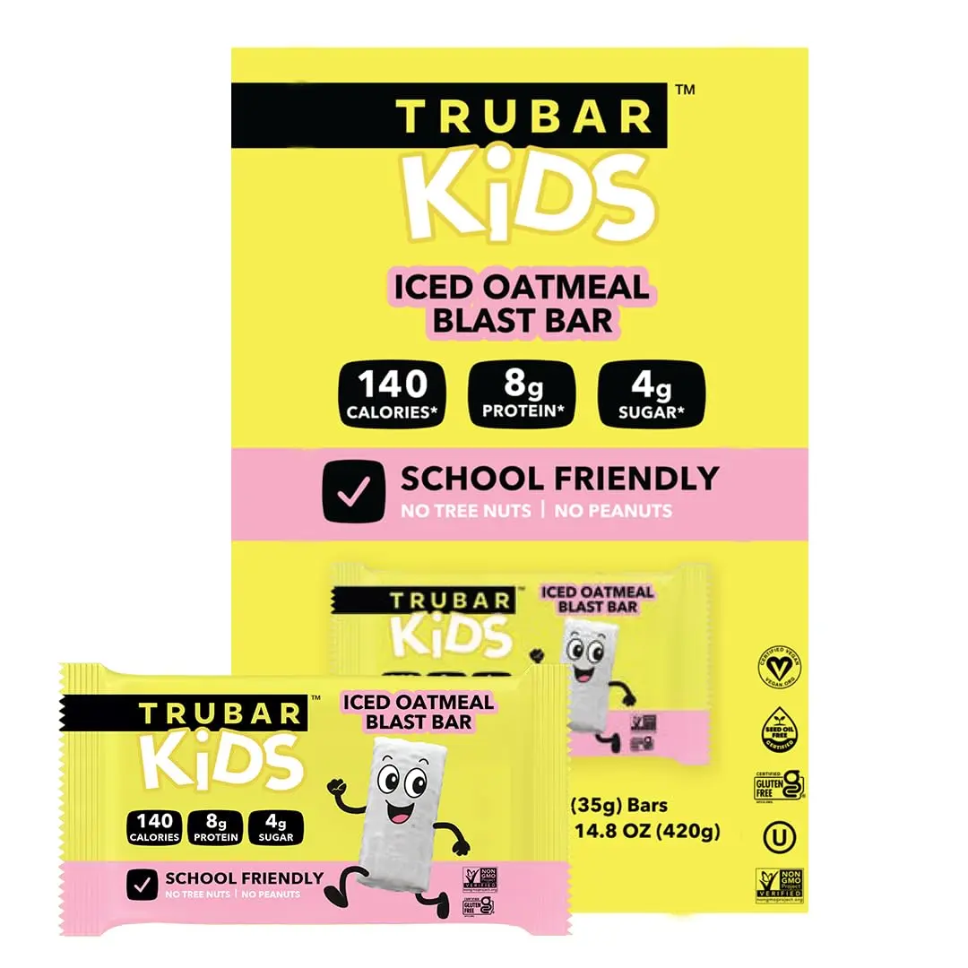 TRUBAR Kids Protein Bars in Iced Oatmeal Blast flavor are soft, chewy snack bars made with plant-based protein and simple ingredients. Designed for lunchboxes, school snacks, and busy family routines, these gluten-free bars provide balanced nutrition with low sugar and delicious cookie-inspired flavor. Individually wrapped for convenience, they are easy to pack for school, travel, or after-school activities.