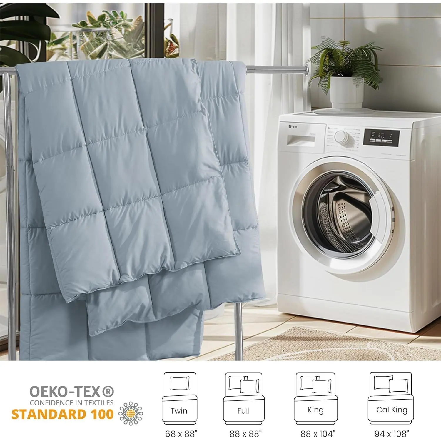 Premium Filling:The comforter filled with 95% premium white goose feather fiber and 5% white goose down,which is fluffy,softand lightweight,suitable for all seasons,enjoy a cloud-like sleep.Skin-Friendly Material:This twin size comforter crafted from a premium 92% Polyester & 8% Nylon blend,this cover delivers the ideal balance of softness,durability,and breathability.Exquisite Craftsmanship:Well-designed 4 side loops&4 corner loops securely hold the duvet insert,the classic box stitched design evenly distributes the filler,double stitching process enhances durability,delicate piping wrapping,wear-resistant and anti-pilling,withstands repeated washings.Secure and Reliable:The duvet is OEKO-TEX Standard 100 certified,which means that the product meets the standard,is safe and reliable,and our goose feather fiber and goose down have been carefully screened,so you can use it with peace of mind.Care Instructions:The comforter is vacuum-packed,gently patted and left to recover for a few hours after opening,comforter can be machine washed in cold water,low temperature drying,can be timed sun drying and patting,it is recommended to use with a duvet cover.