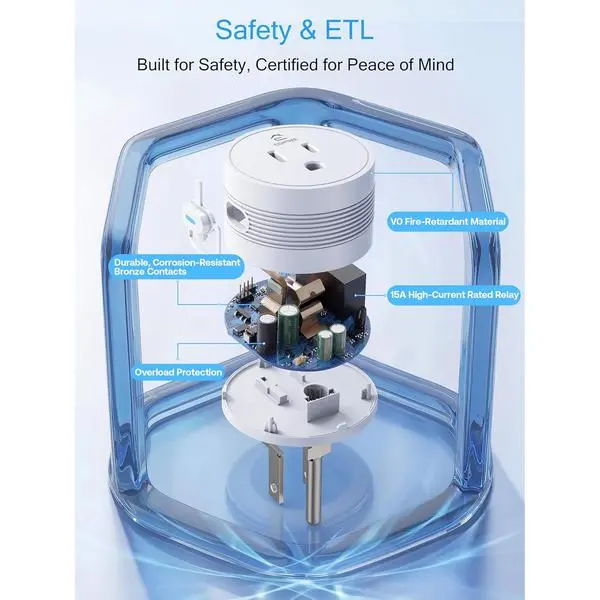 ·[Compact & Safe Design]: Flame-retardant housing, child safety shutters, and overload protection. FCC/ETL certified smart outlet for peace of mind.