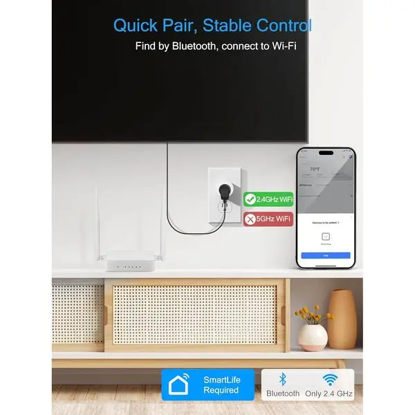 ·[Stability Easy Setup]: Set up easily with Bluetooth, then switch to 2.4GHz Wi-Fi for continuous to keep stable remote control outlet via 2.4GHz Wi-Fi from anywhere using your phone. Note: . !
