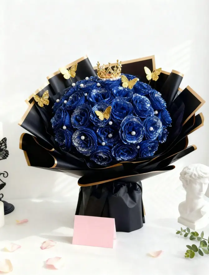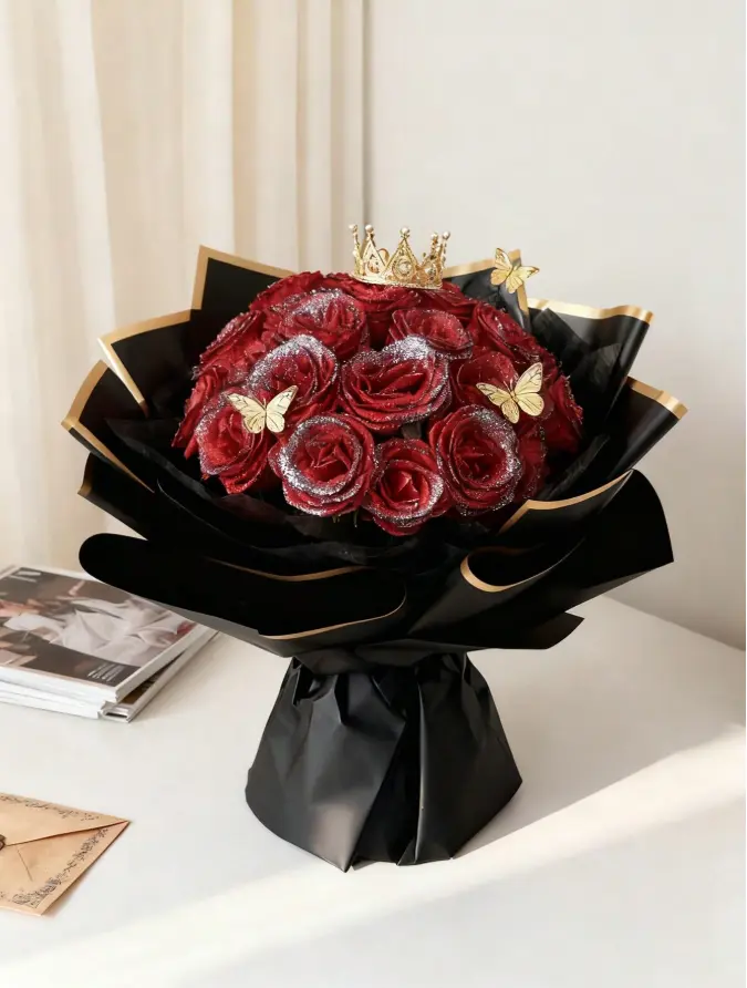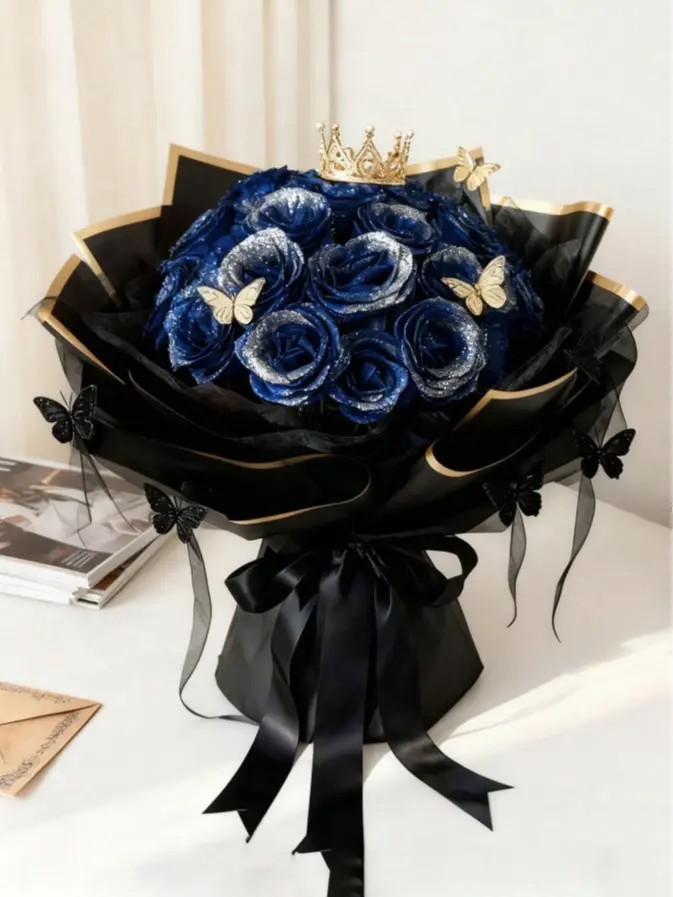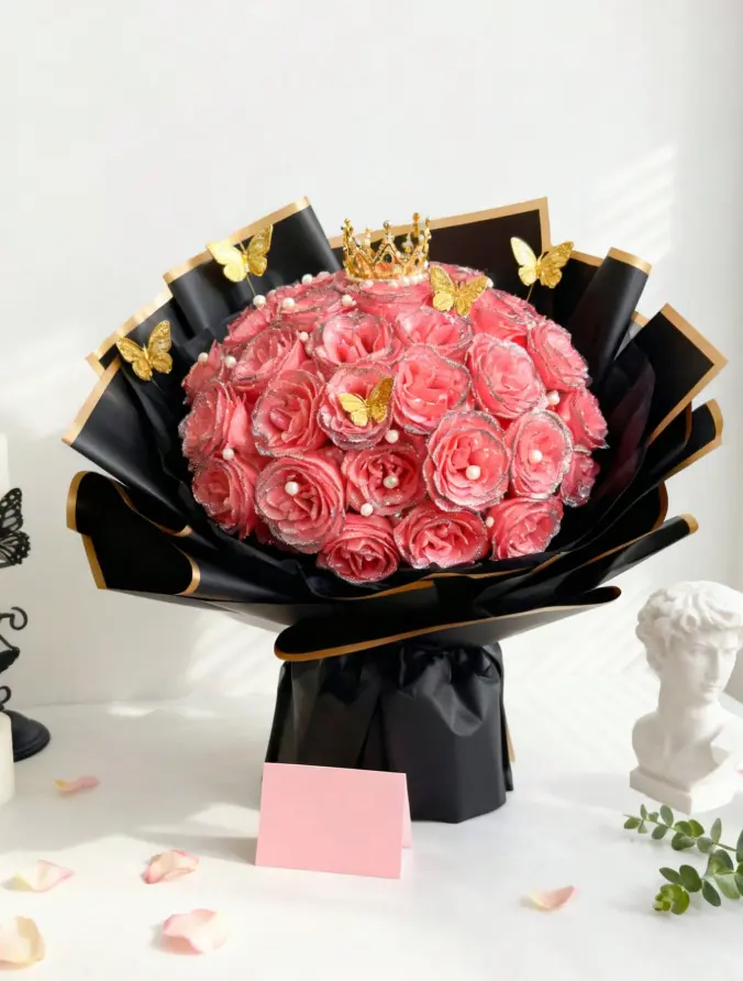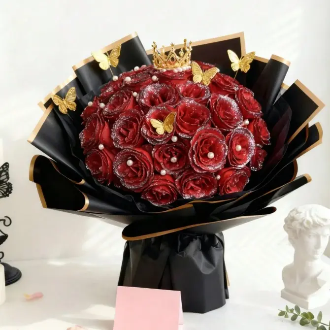 This glitter purple rose bouquet set adds a dreamy shine to any room or special moment. Beautifully wrapped and everlasting, it’s the perfect mix of romantic gift and stylish decor.