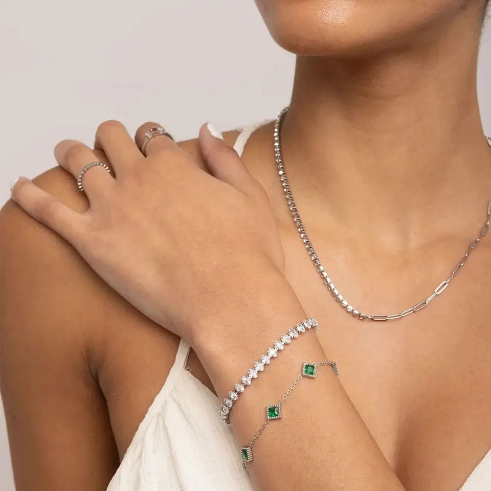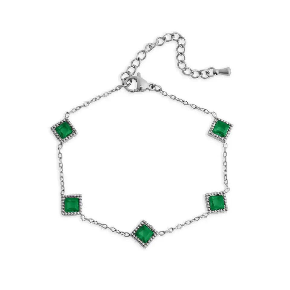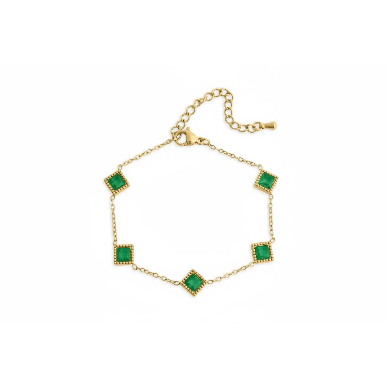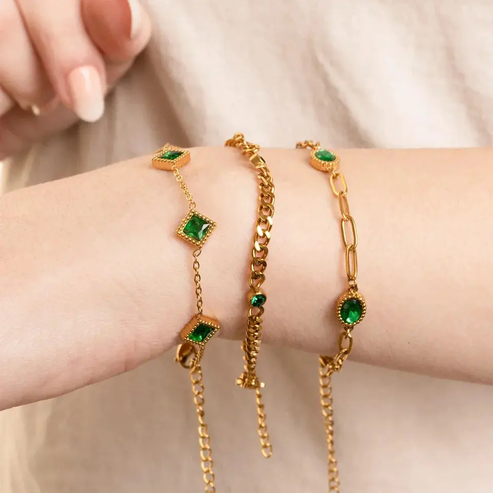 Five faceted emerald-green stones, each set in an antique gold-tone beaded diamond frame, drift along a delicate rolo chain. The rotating lobster clasp and adjustable extender ensure a perfect fit. A piece that reads heirloom — priced for every day.