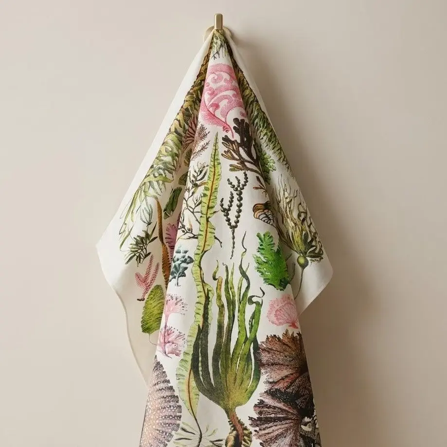This bandana features a playful, hand-drawn design inspired by a classic Mediterranean picnic — think sardines, fresh lemon slices, and olives, all framed by a timeless striped border. The vibrant blue ink pops perfectly against the natural cotton background, creating a fresh yet vintage aesthetic that’s easy to style year-round.