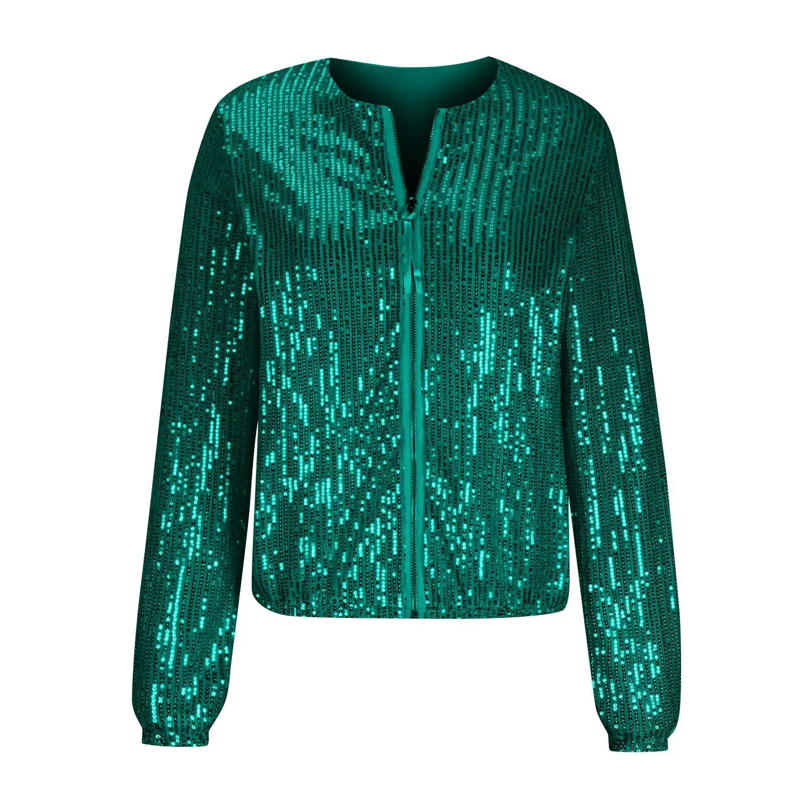 Women Autumn Spring Casual Glitter Sequins Long Sleeve Coat Commute Short Cardigan Jacket Elegant All Zipper Loose Outwear
