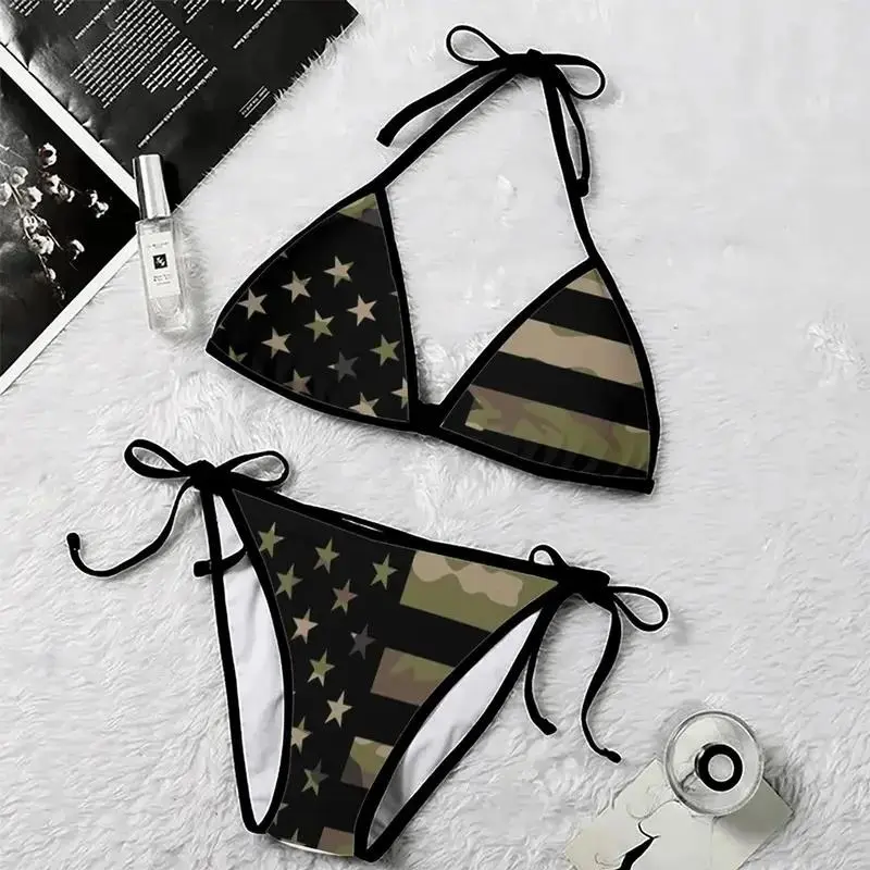 Camo Couple Swimwear Set USA Flag, Camouflage Bikini & Mesh Shorts, 4th of July Matching Swimsuit, Patriotic Beach Outfit