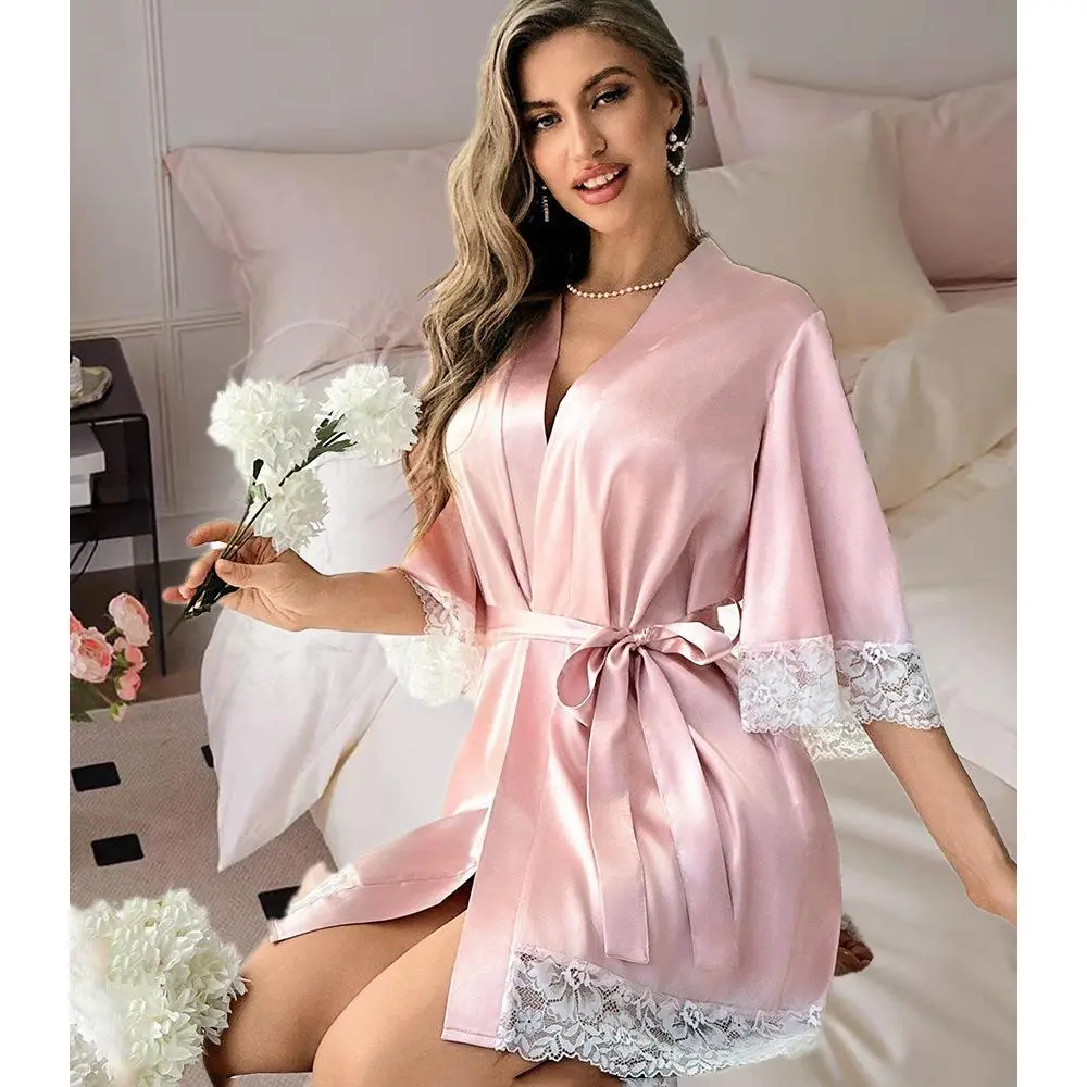 2026 New Ladies Elegant Satin Robe Lace Trim Kimono Short Sleepwear Nightgown V Neck Belted Bridal Loungewear Bridesmaid Gift