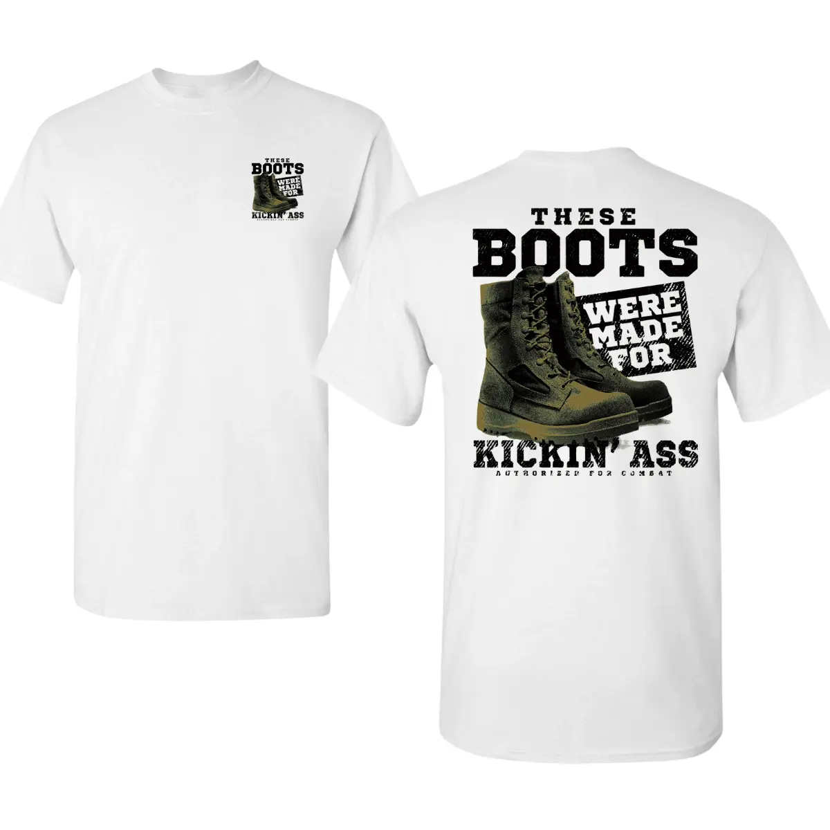 Make a bold statement with this These Boots Shirt, featuring the iconic phrase These Boots Were Made For Kickin Ass with a rugged military boot design. Perfect for strong personalities.