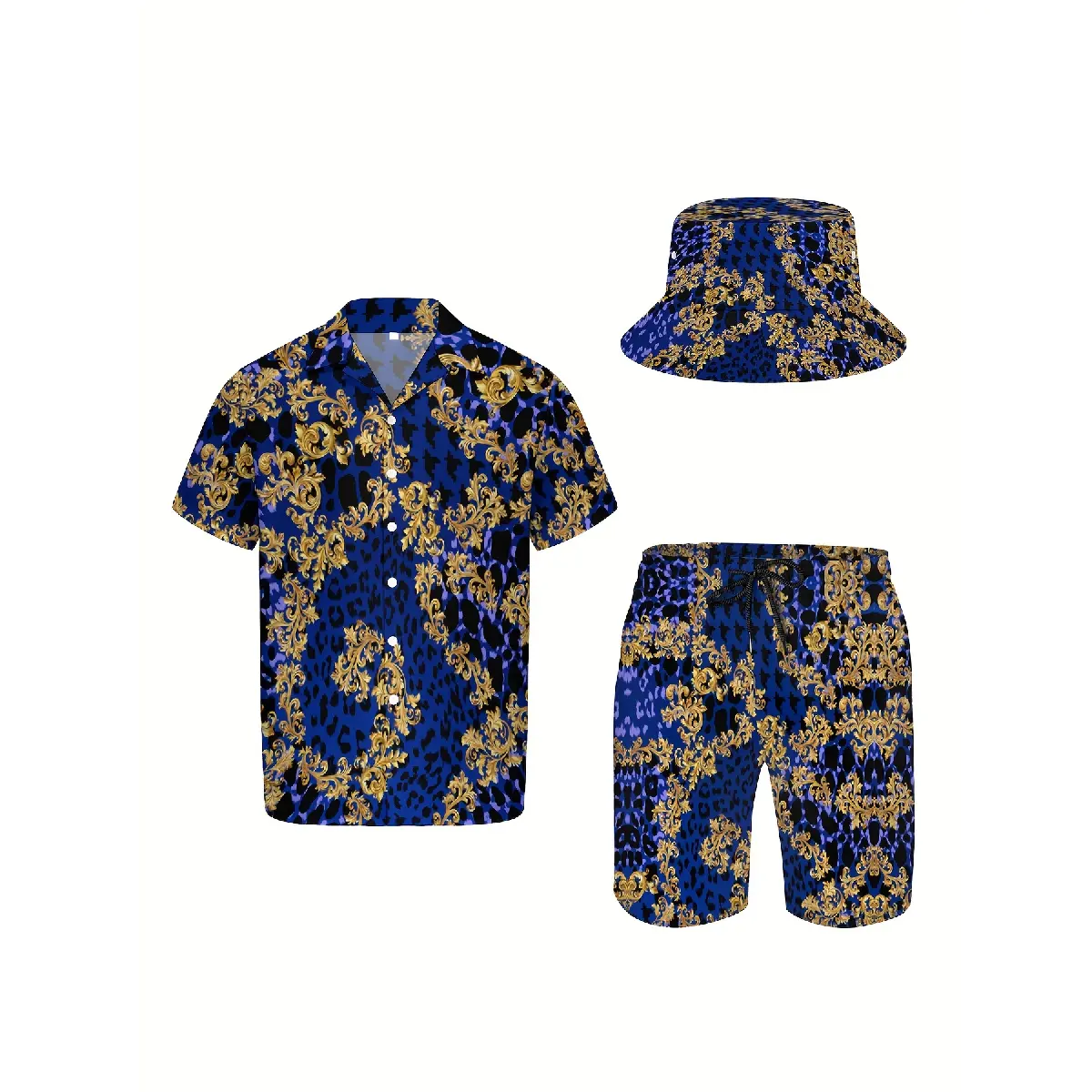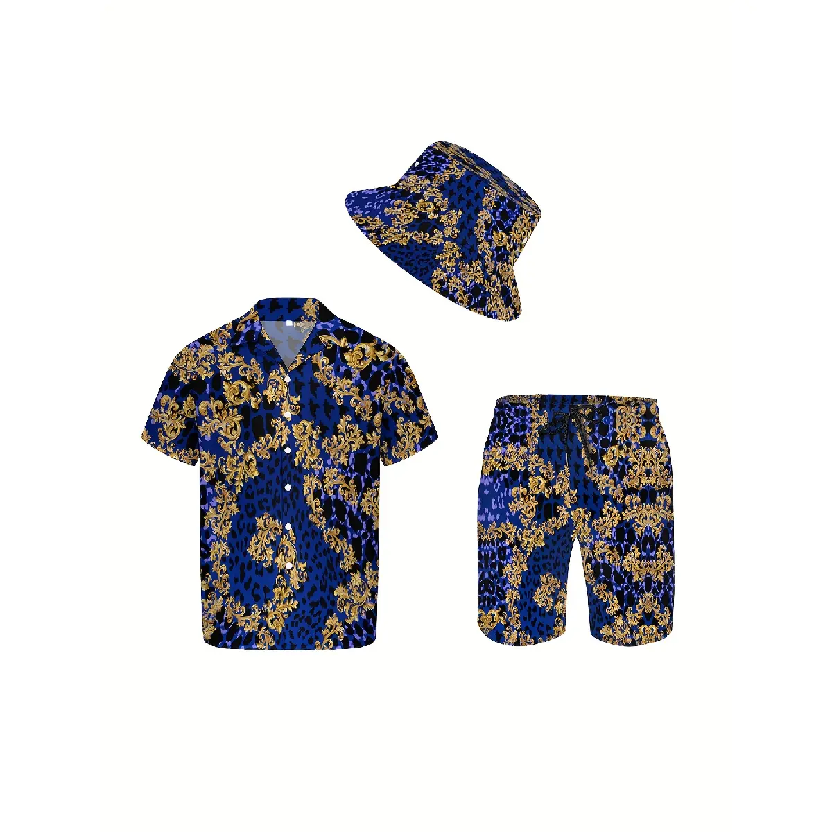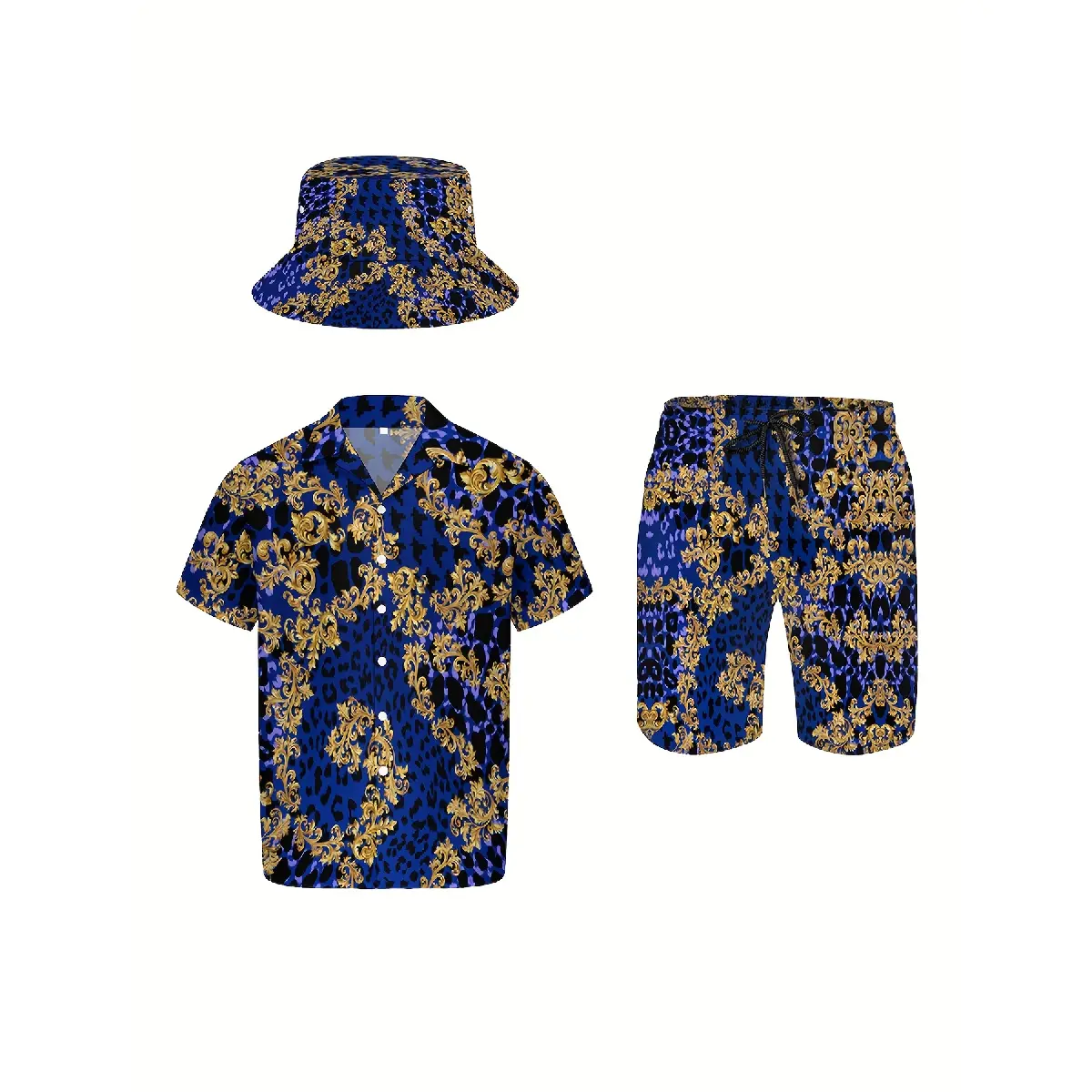 3pcs Men's Hawaiian Shirt And Short Set, Blue Luxury Golden Baroque Soft Fabric Breathable Shirt Button Short Sleeve Casual Beach Shirts Outfits with Bucket Hats