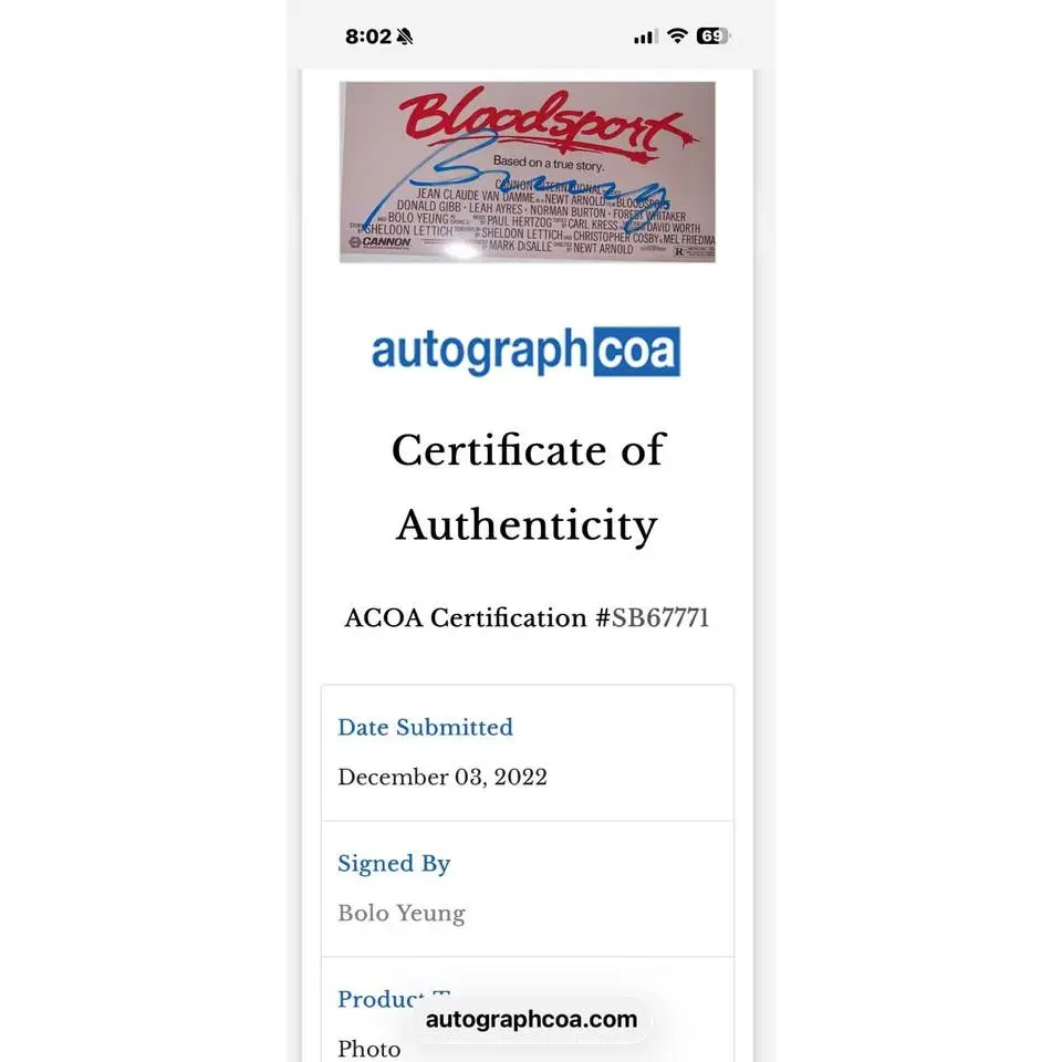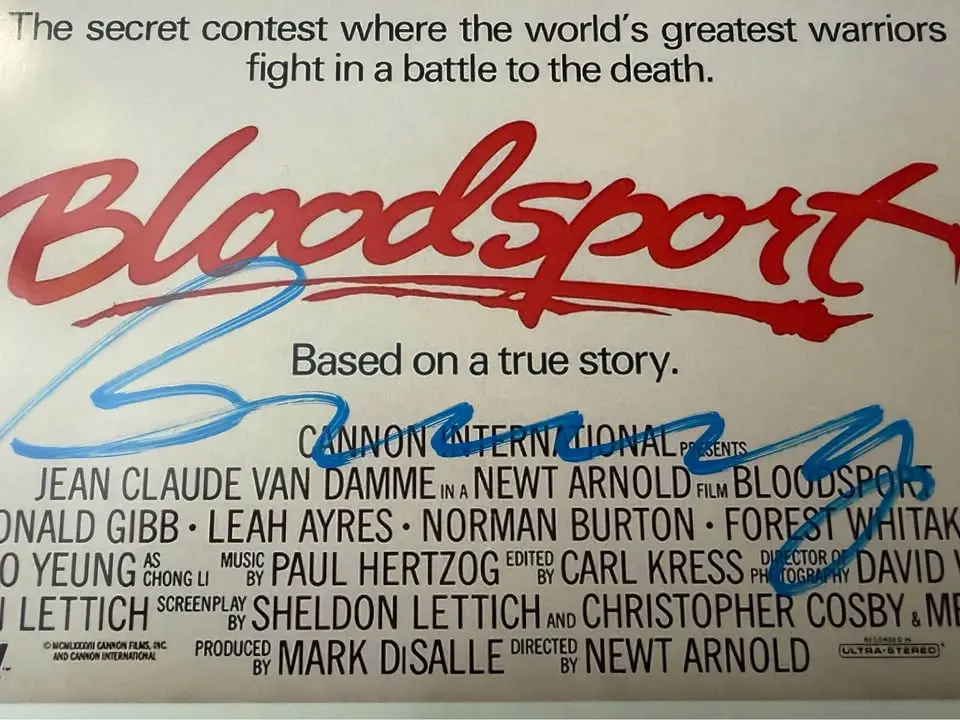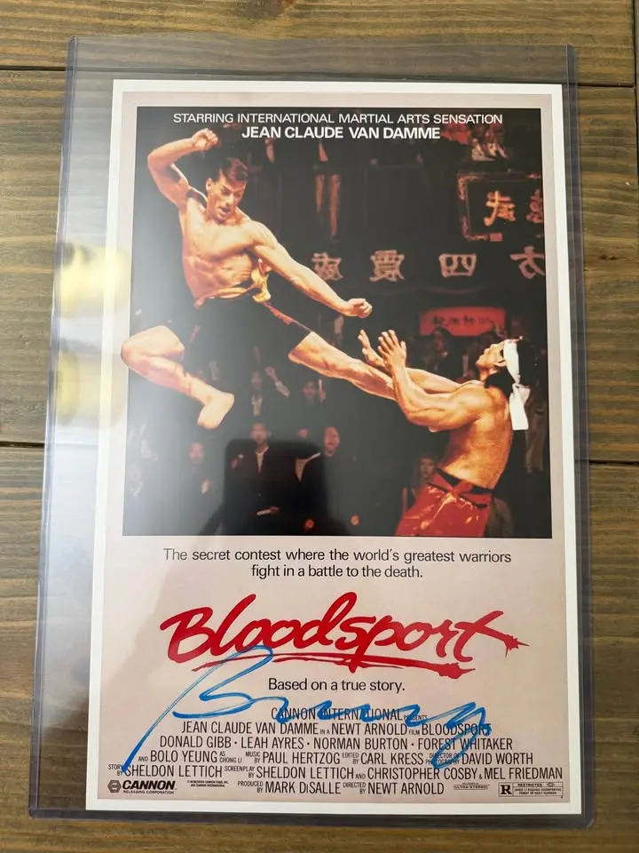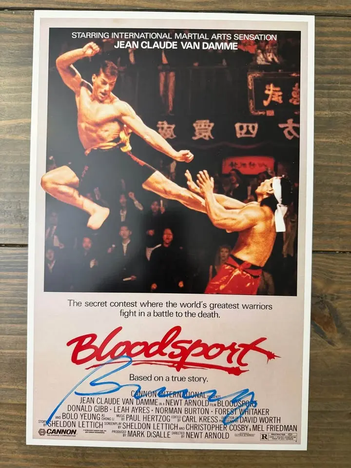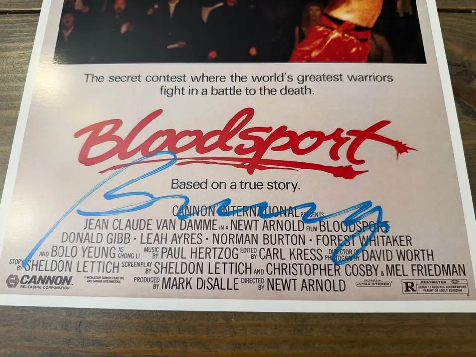 This is an authentic 11x17 Bloodsport movie poster photo hand-signed in blue marker by legendary villain Bolo Yeung (Chong Li) โ co-starring Jean-Claude Van Damme.