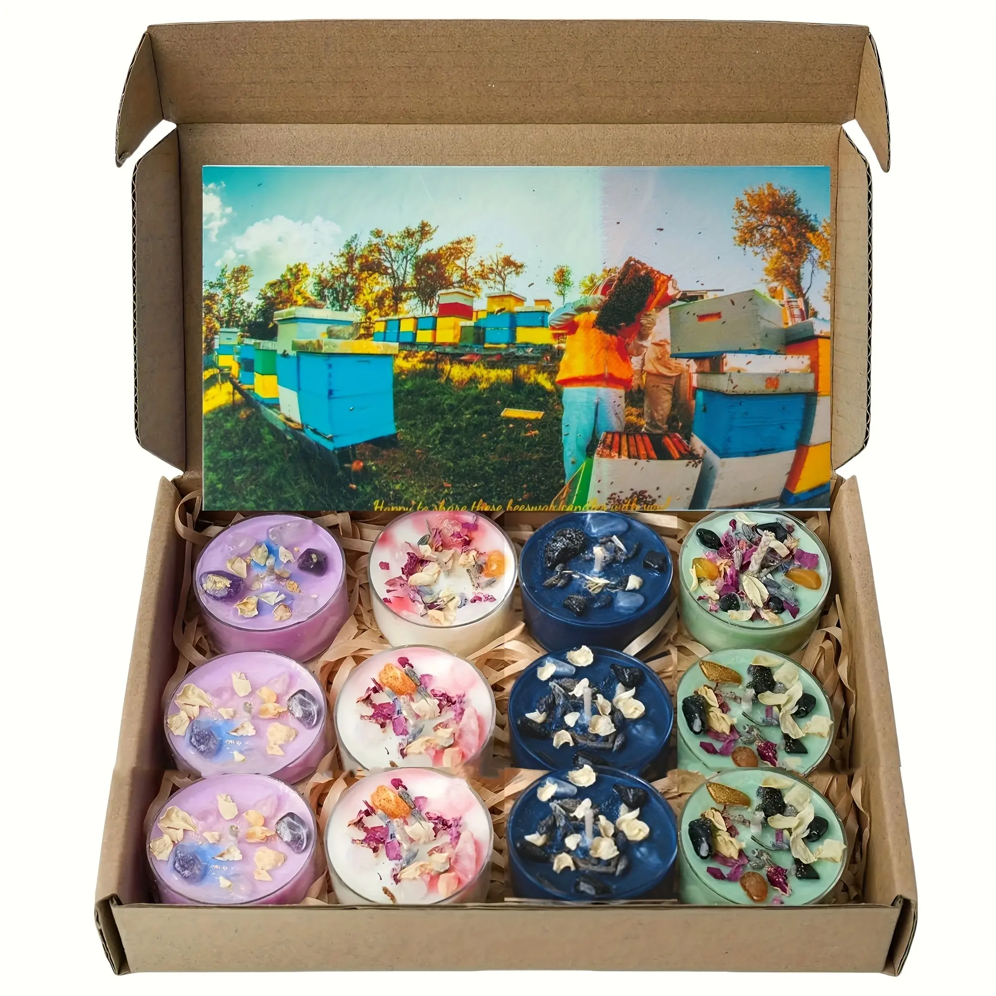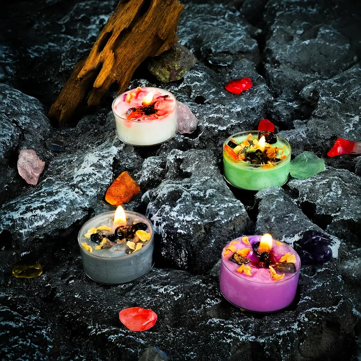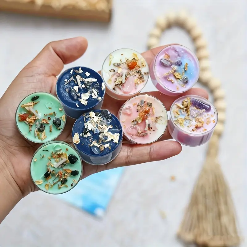 This curated set includes 12 handmade tea light candles in 4 unique scents, each paired with natural crystals and dried flowers. The variety pack lets you enjoy different fragrances and crystal energies, perfect for any mood or occasion.