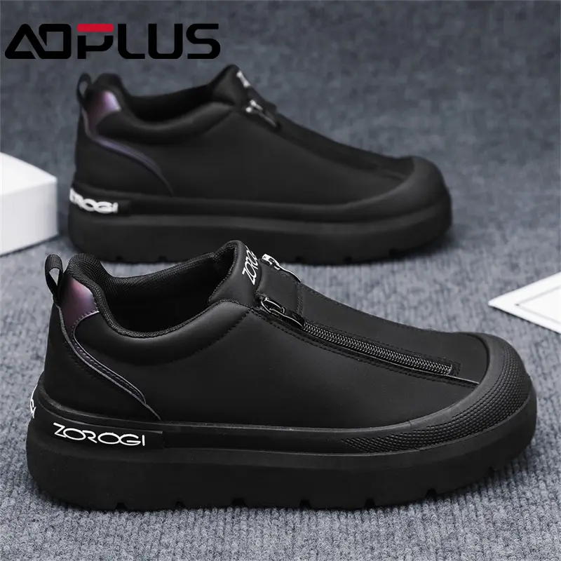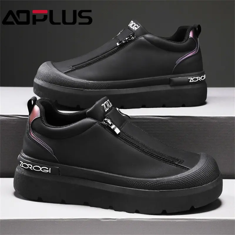 The AOPLUS Men's Slip-On Sneakers are the perfect blend of modern design and practicality.Featuring a sleek black color with a unique zipper closure, these sneakers offer both style and ease of use.The elevated platform sole provides added height and a trendy look, while the comfortable construction ensures your feet stay relaxed all day.