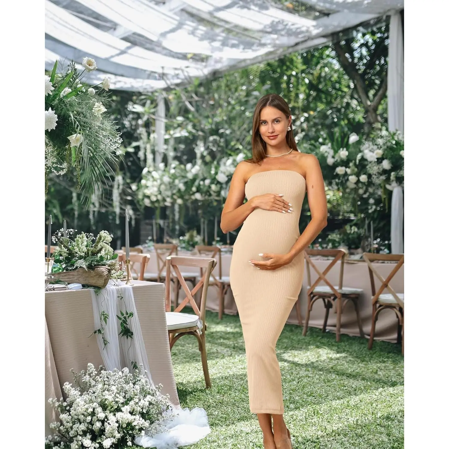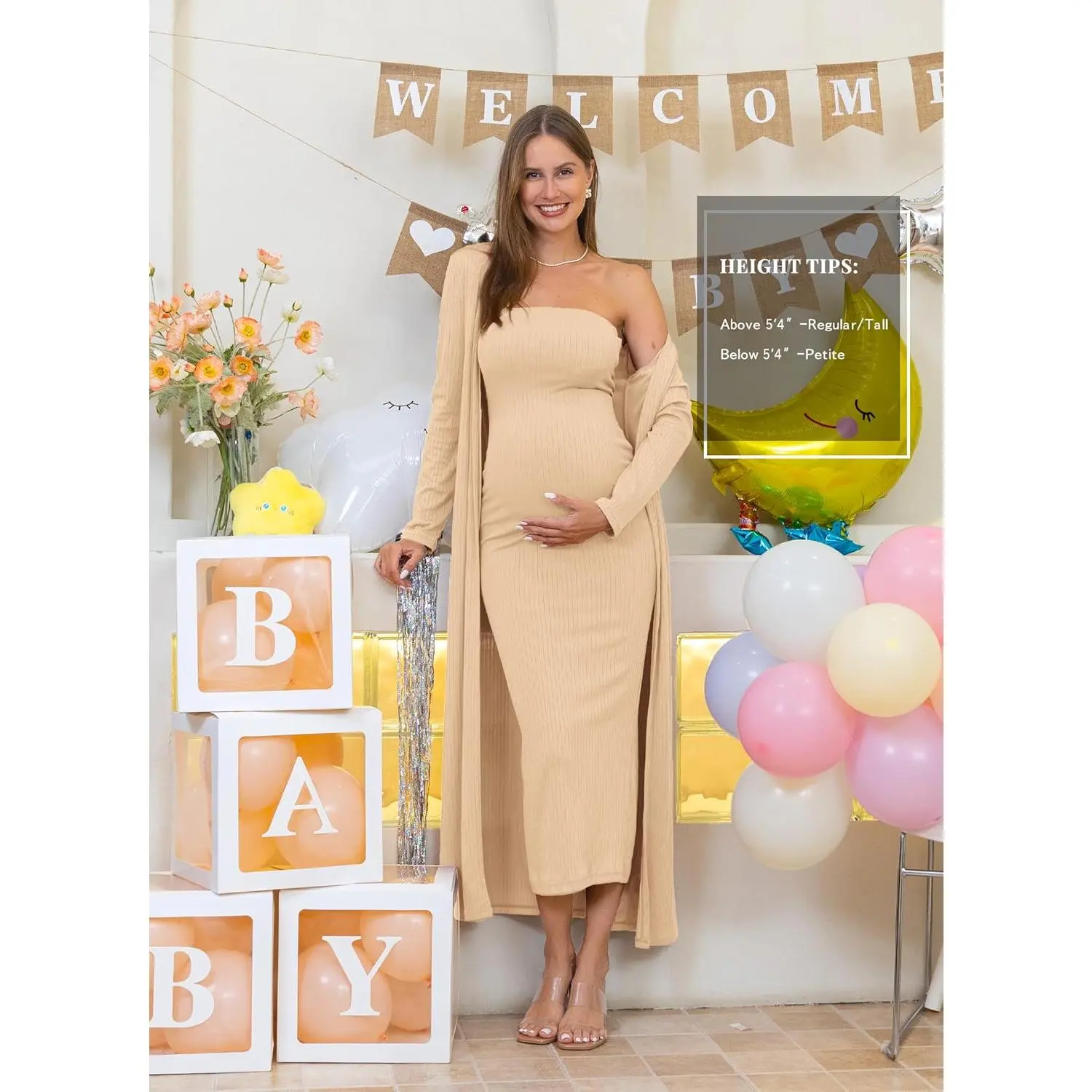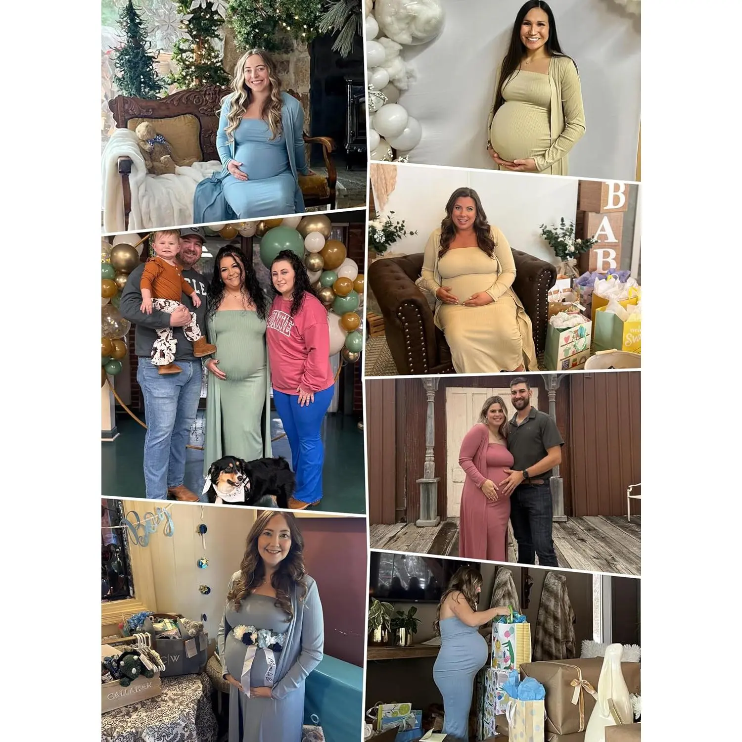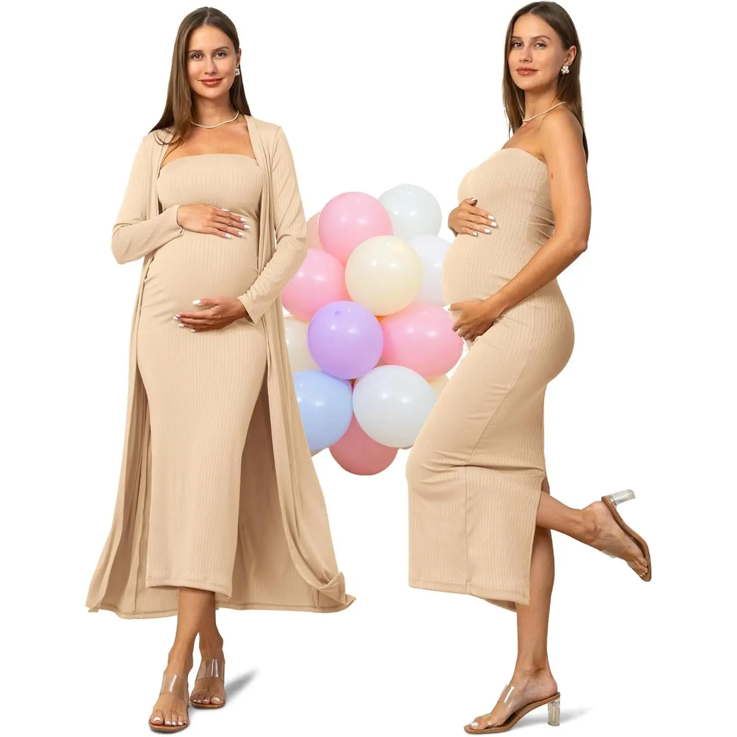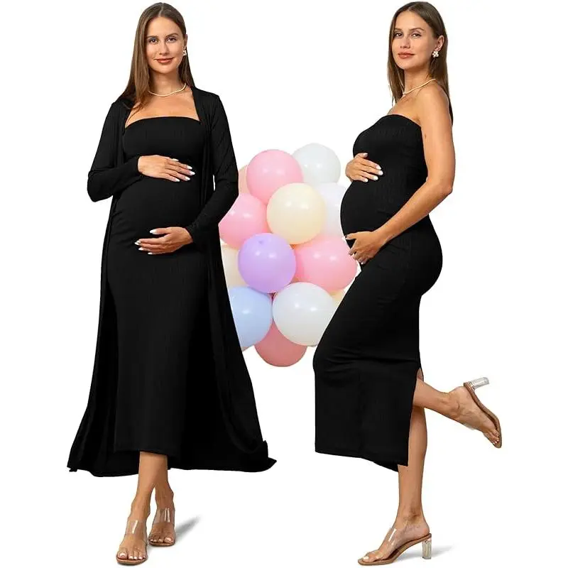 COLOR REMINDER:This 2 piece maternity dress&cardigan some light colors (such as white, light pink, and light beige) may appear slightly sheer under strong lighting,we recommend wearing seamless nude-colored underwear to avoid visible lines. The long materntiy dress is made of soft, stretchy fabric,suitable for different body shapes, can be worn not only by pregnant women but also by non-pregnant women, SIZE TIPS: This tube dress features a strapless, elastic band that fits snugly around the bust and belly. if you're over 5 months pregnant or have a visibly growing belly, we suggest sizing up for comfort,customers with fuller hips or abdomen should also consider a larger size, if between sizes, choose the bigger one. BODYCON MATERNITY DRESS:The tight fitted maternity dress features a strapless,fitting design with a slit,the strapless part employs a wide elastic band to reduce constriction,providing ample elasticity suitable for different body types and preventing slippage,the back of the formal long maternity dress hem has a slit for ease of movement,ensuring comfortable walking,the fitting design accentuates the body's contours beautifully,offering a stylish and elegant look. MATCHING STYLE:You can also wear them separately,the maternity tube maxi dress can be worn alone outside in the summer,easy to match with heels,sandals,necklaces,transition from casual daytime wear to glamorous evening attire,the maternity cardigan can be paired with various outfits,whether it's a simple t-shirt and jeans for a casual look or a dress for a more sophisticated ensemble. OCCASION:This casual maternity 2 piece clothes fits for daily wear,attending baby shower,wedding guest,photoshoot,party,also a great clothes choice for pregnancy and postpartum,maternity cardigan for dress's versatility makes it suitable for different occasions,from a relaxed day out to a more formal gathering.