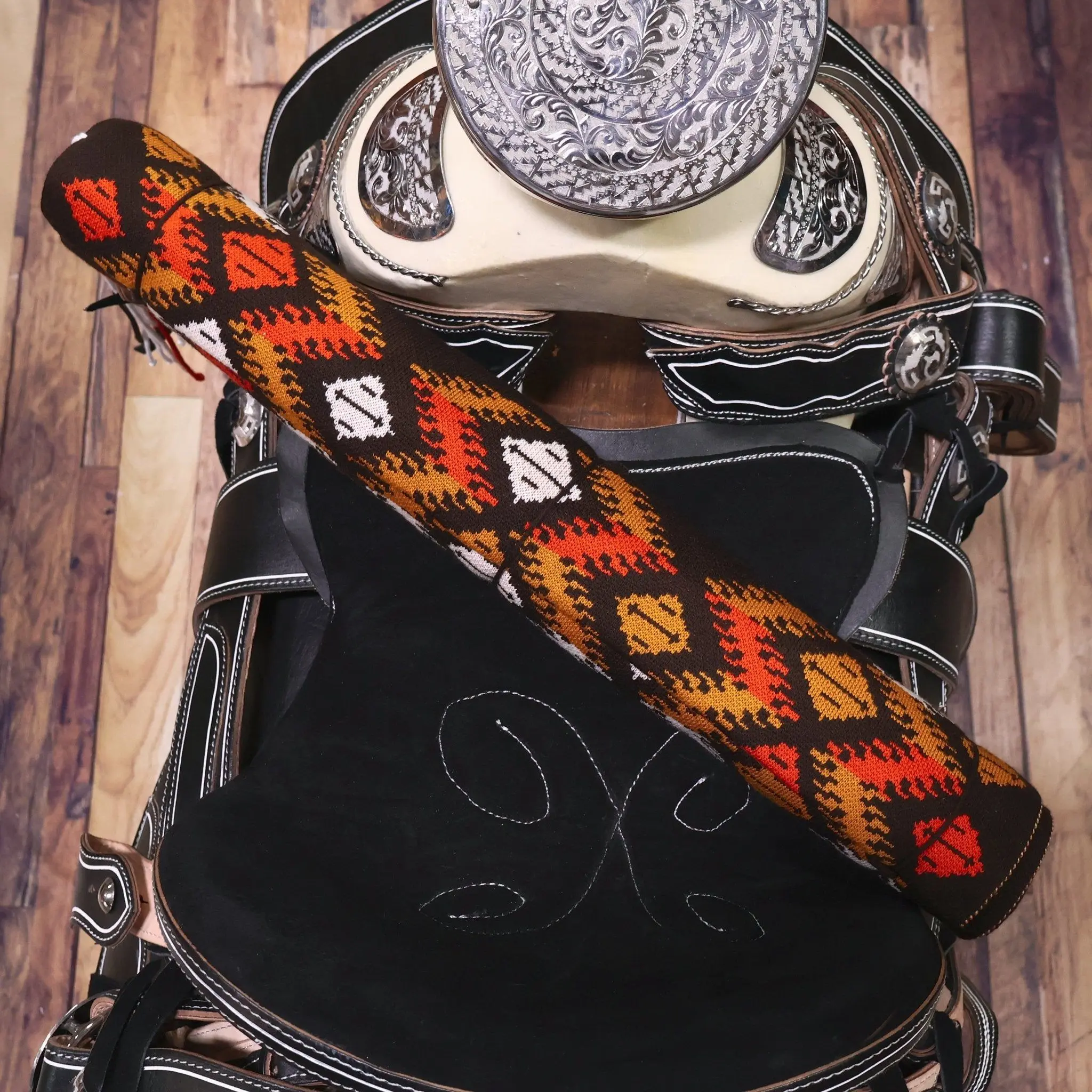 Traditional heavy charro saddle sarape in a fino diseño pattern and classic charrería style to your montura charra.