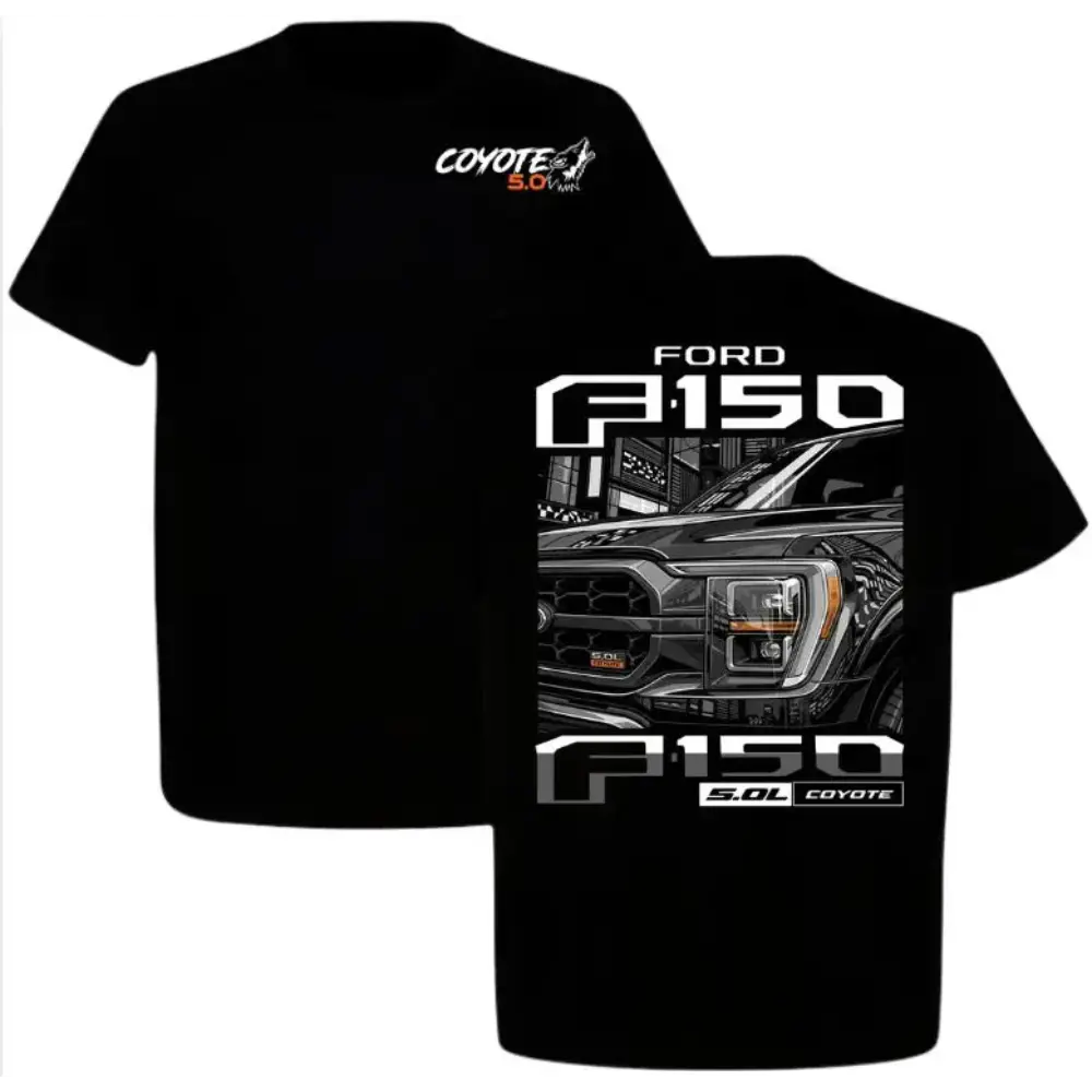 Ford F150 Coyote 5.0 engine graphic t-shirt for truck enthusiasts-men's black pickup truck tee-automotive fan apparel-premium short sleeve cotton shirt with iconic design