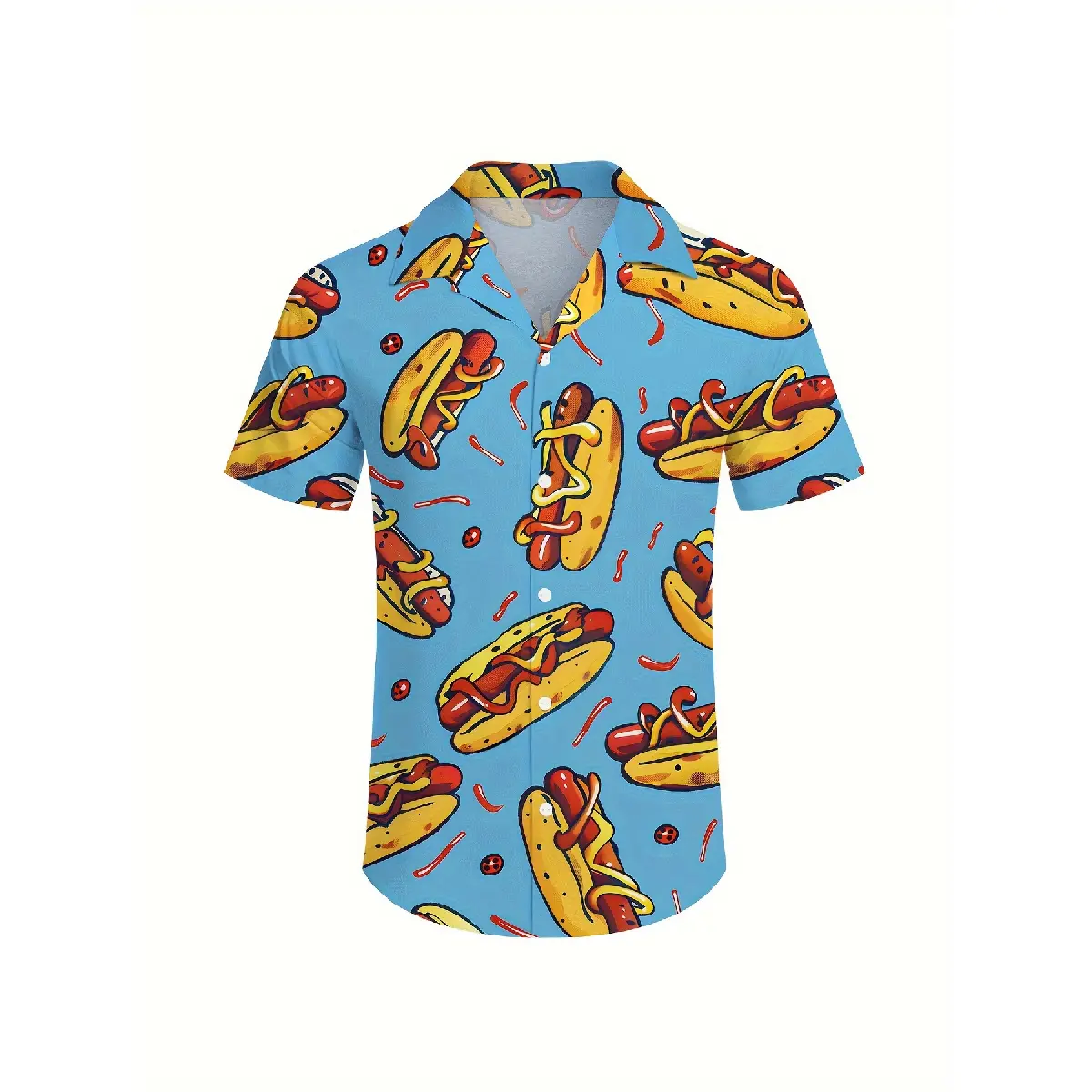 Men'S Three-Piece Vintage Beach, Featuring Hot Dogs And Ketchup Themed Activewear, Hawaiian Style Sports Outfit, Including a Shirt, Beach Shorts, And a Bucket Hat